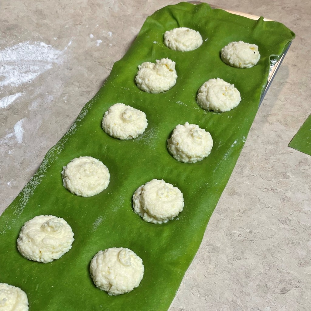 - Fold the dough over the ricotta dollops, taking care to keep the edges aligned. Carefully press out any air pockets, starting from the folded edge, then in between dollops. Seal the open edge last to ensure no air bubbles are trapped.