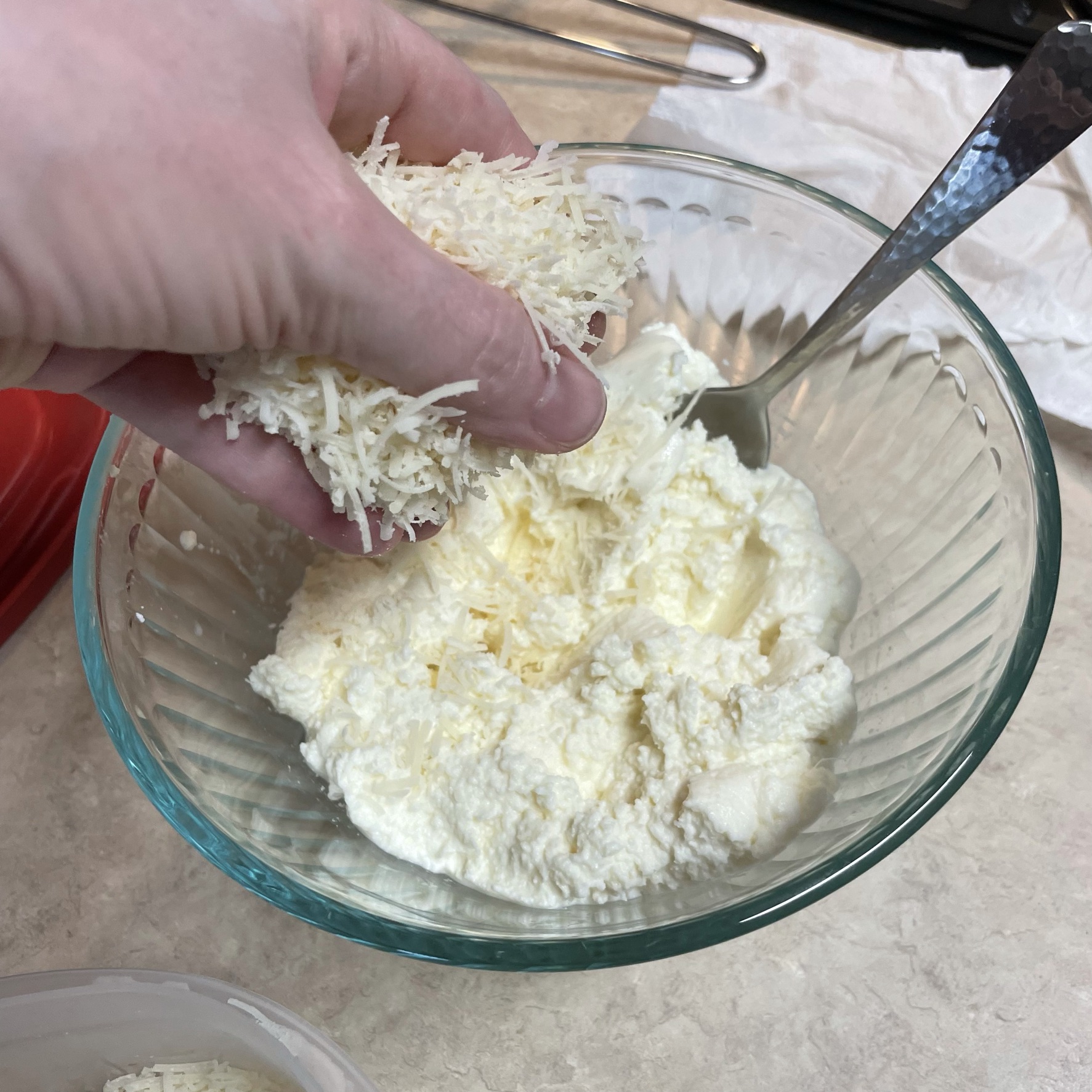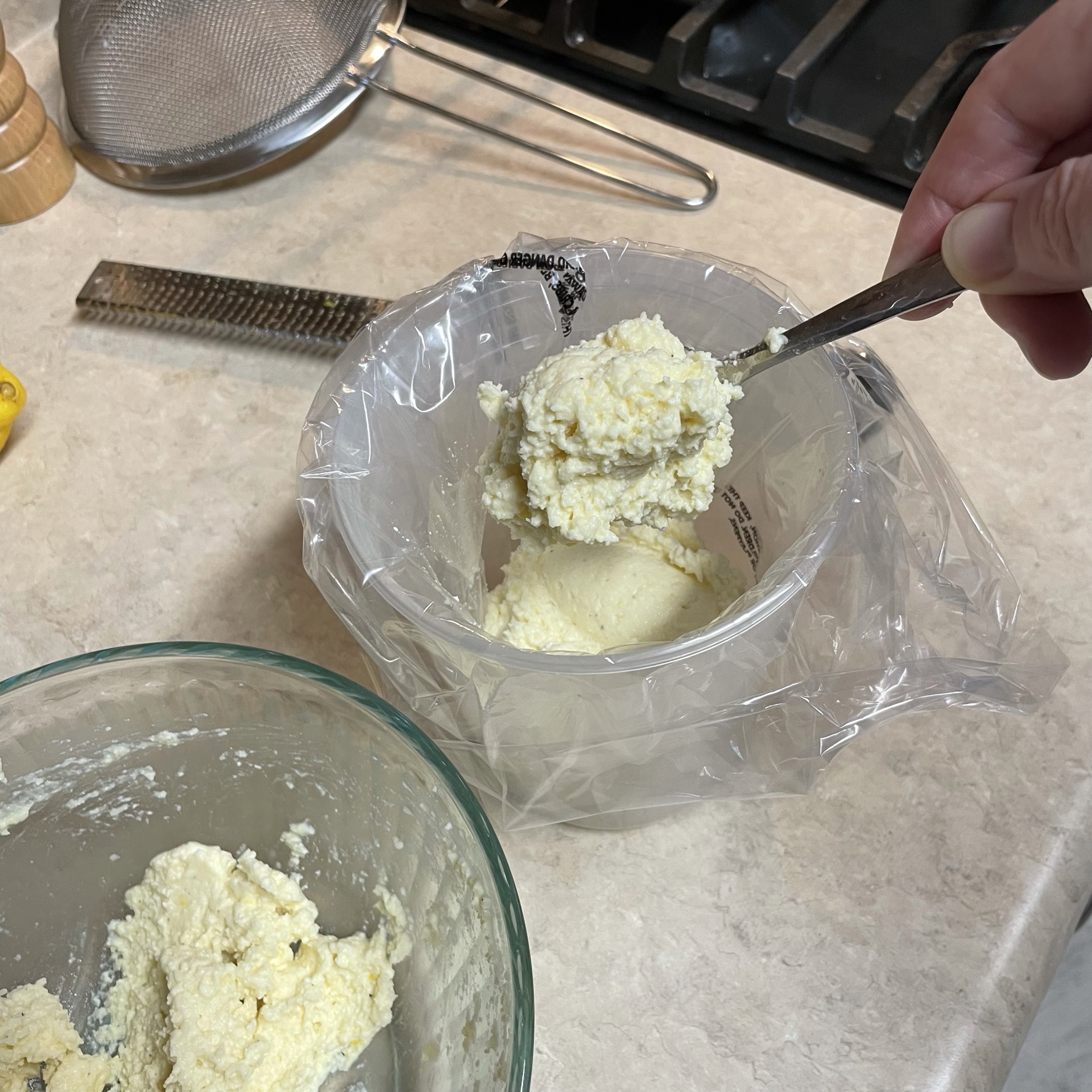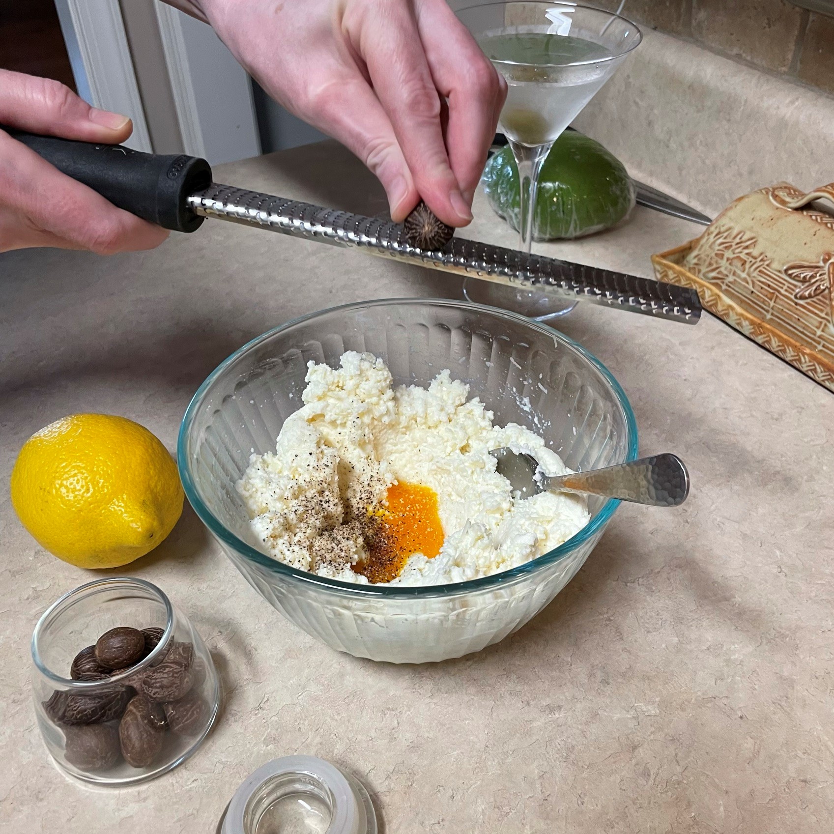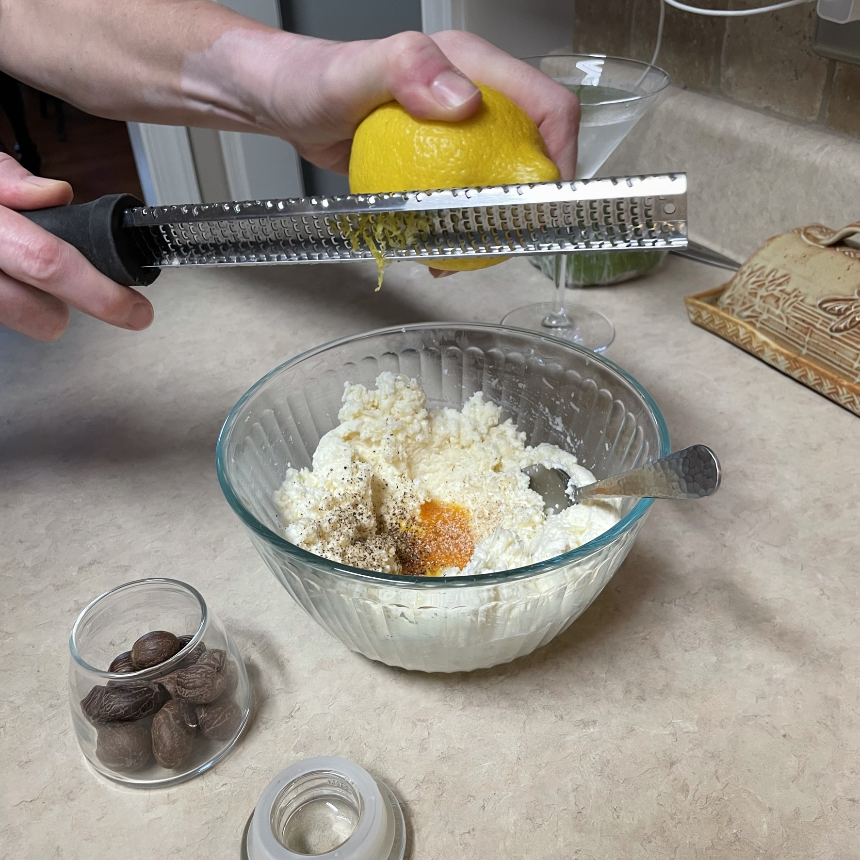 Strain the ricotta in a mesh strainer (lined with cheesecloth if you have it) over a medium bowl. Let the ricotta drain for at least 30 minutes. Stir in parm-romano, egg yolk, lemon zest and nutmeg. Salt and pepper to taste. Spoon the mixture into a plastic bread bag for easy piping. Refrigerate mixture while you roll out the pasta dough.