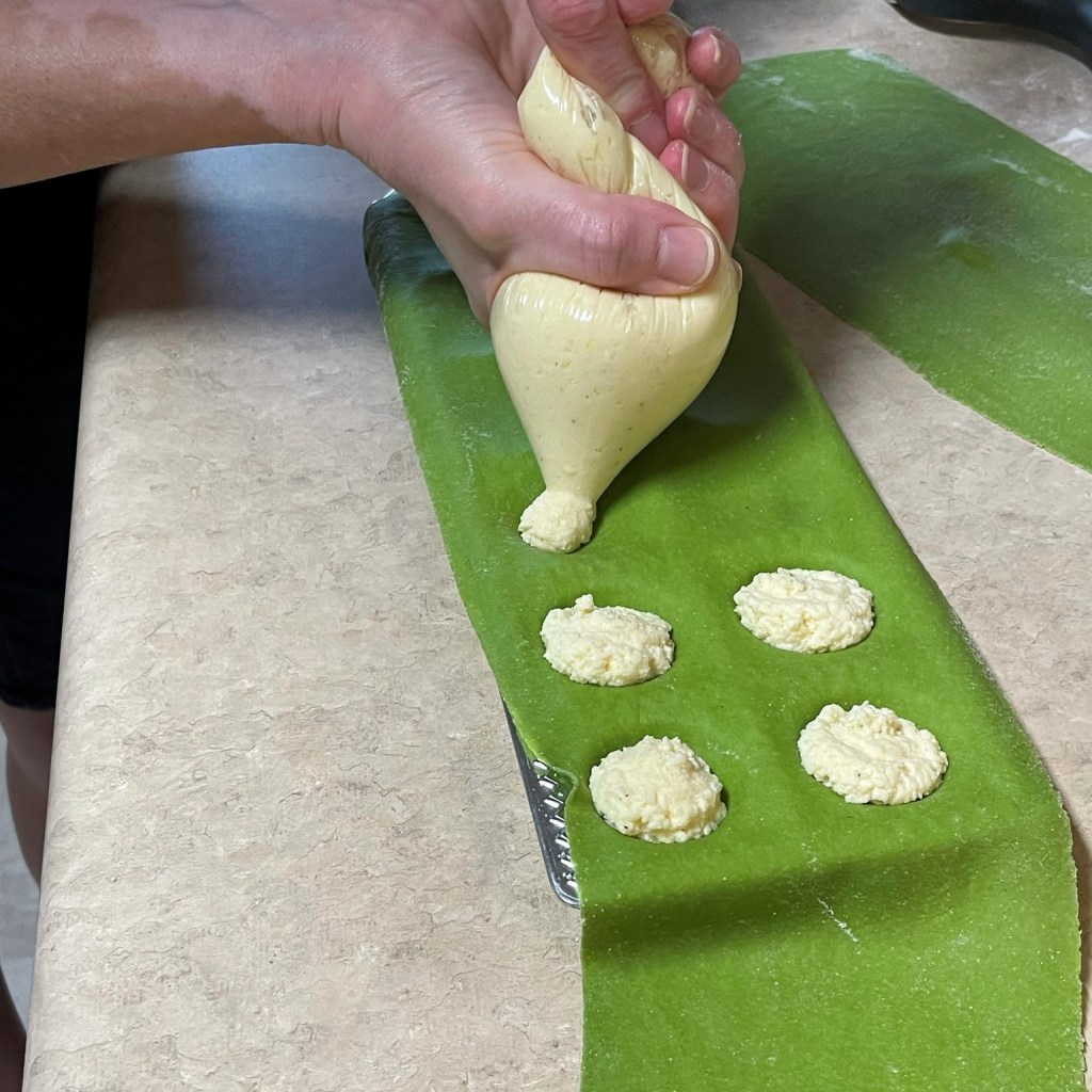 - If you are making ravioli without a mold, squeeze 1 1/2 teaspoon-sized dollops of ricotta filling onto one long side of the pasta sheet. Space the dollops about 2 inches apart, allowing room to seal up the pillows on all sides. Dip a finger into a small bowl of water and slightly moisten the dough in between ricotta dollops and along the long edge.