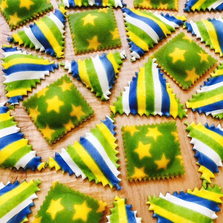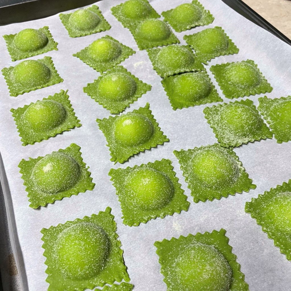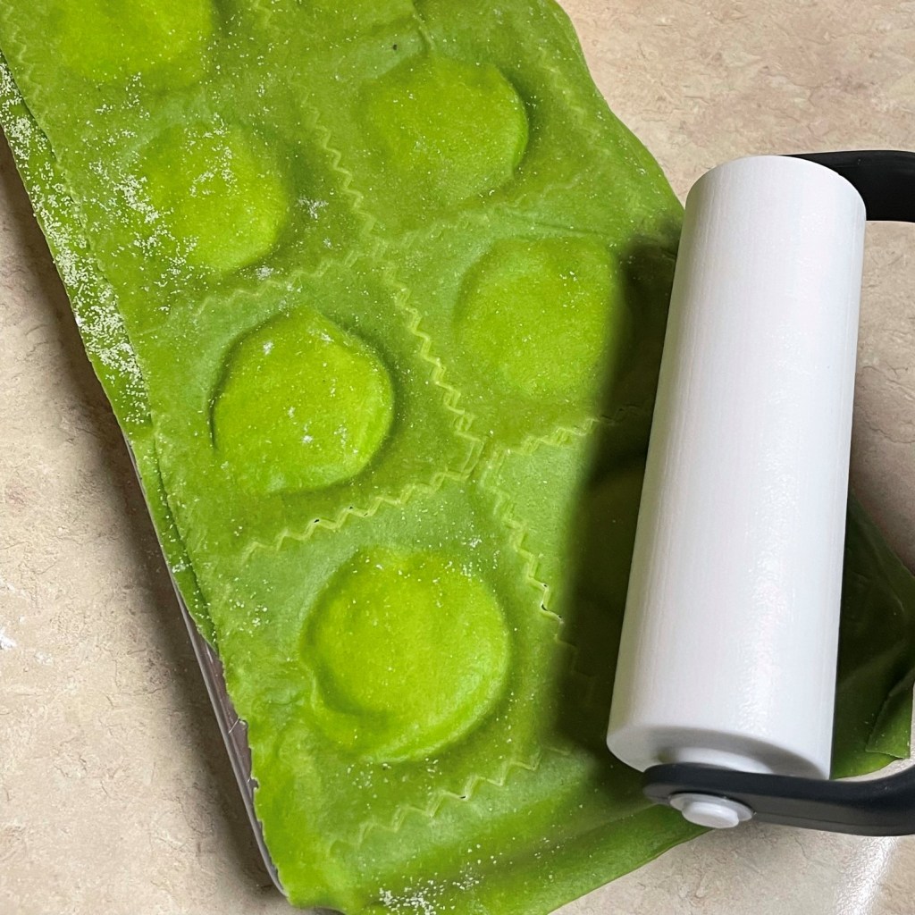 - Use a pizza wheel or sharp knife to trim any ragged edges. Cut between the raviolis and transfer them to a semolina- or flour-dusted parchment paper. Allow the ravioli to dry for at least an hour before cooking.