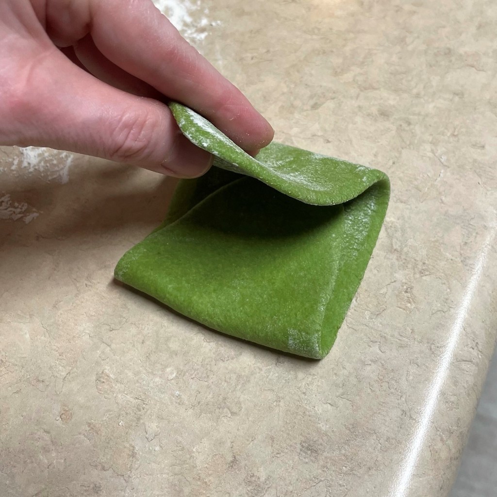 For starters, her instruction shifted me away from extensive kneading of the dough to a simpler means of laminating the dough to build gluten strength. Laminating means “layers.” After a brief kneading and a half-hour rest, you repeatedly fold the sheets of dough onto itself, layer upon layer, as you run it through the pasta machine. As you go, the dough becomes more and more supple and strong enough to withstand pressing into thin sheets for ravioli. This is good news for anyone who finds kneading tedious or painful.
