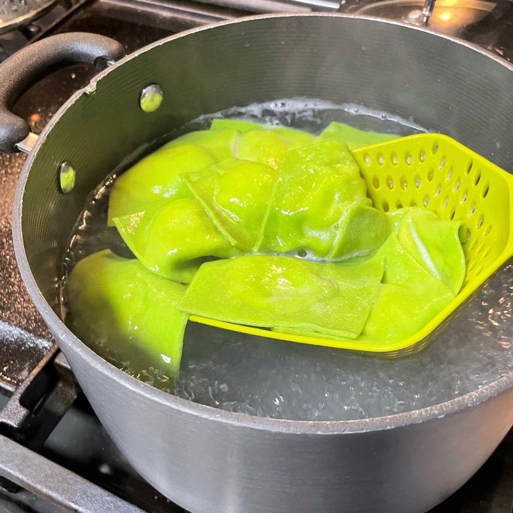 Your cooking water should be seasoned with salt and simmering at a low boiling point. Add ravioli carefully.