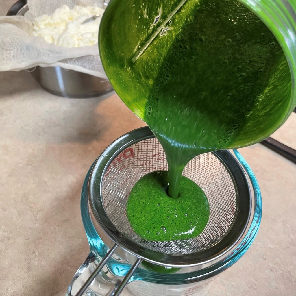 Next, the color of the pasta can be intensified with a simple addition of baking soda in the blanching water for any vegetables you use to color up your dough; then, a quick straining through a mesh sieve weeds out the solids for a cleaner-looking dough. In the past, I have simply wilted spinach in a pan and pureed it into my dough. My previous results were good, but not this good.