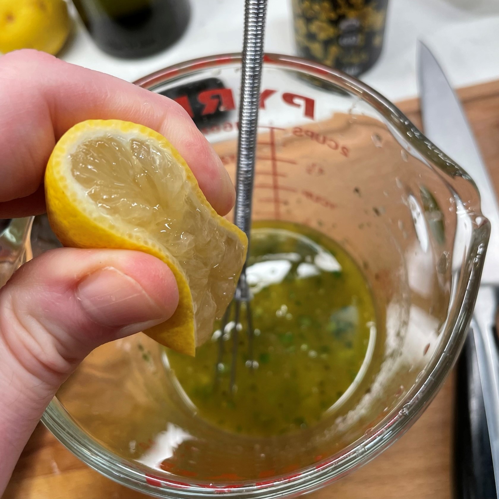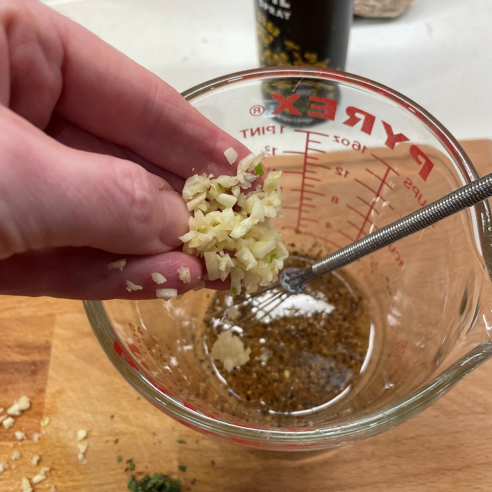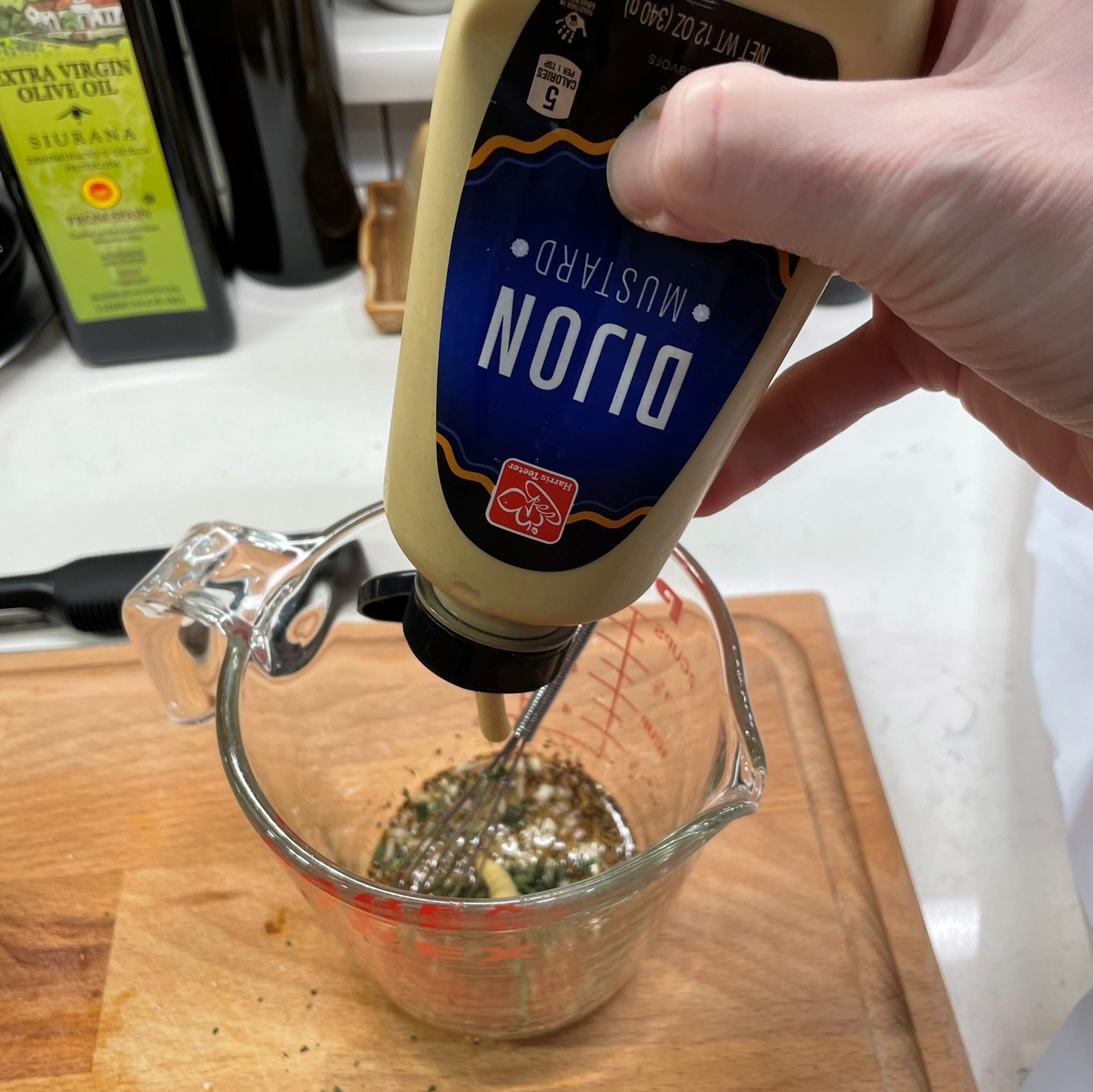 Vinaigrette is one of the simplest salad dressings to make at home. I usually make it in a glass measuring cup for easy pouring, but if you want to make it even easier, put all the ingredients into a small jar with a lid and shake the dickens out of it. My recipe for this vinaigrette is included in the downloadable PDF at the end of this post. You’ll need a light vinegar, Dijon, fresh garlic, oregano and lemon, and extra virgin olive oil.