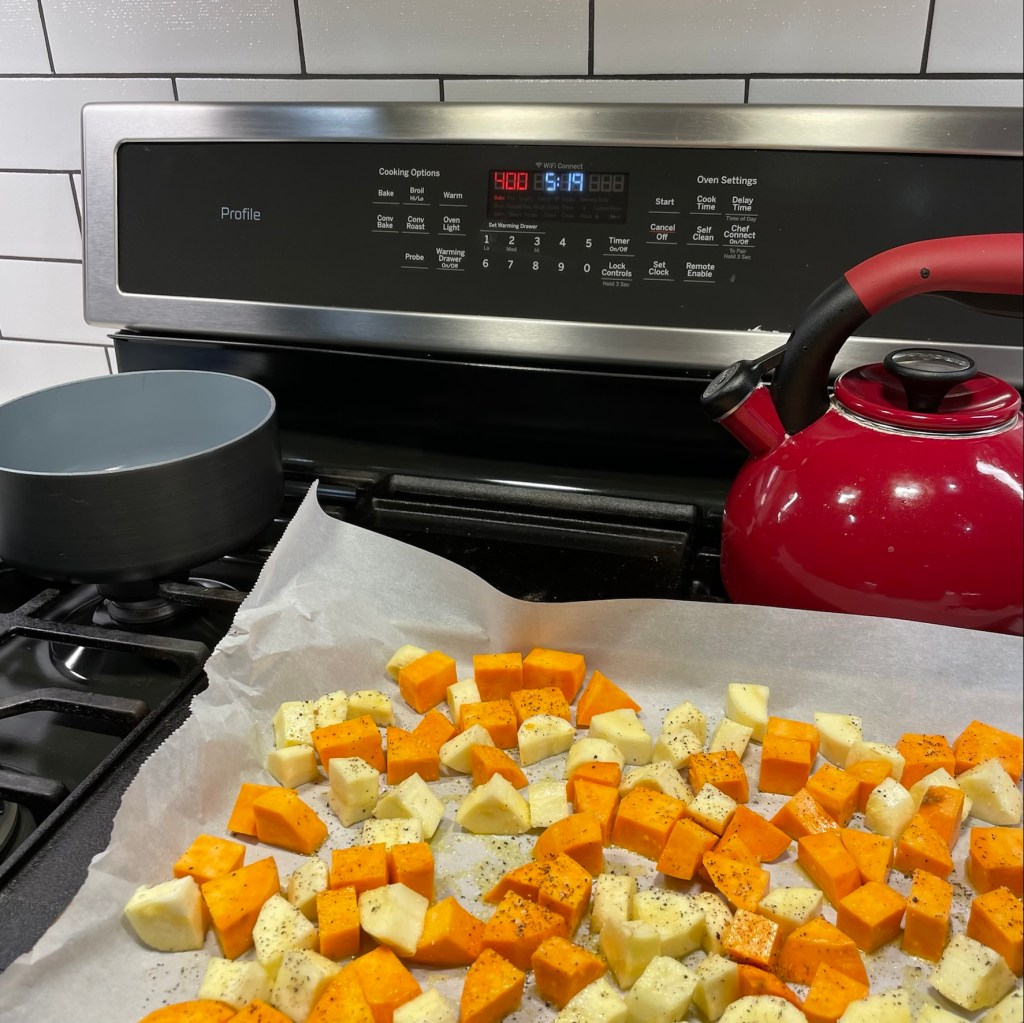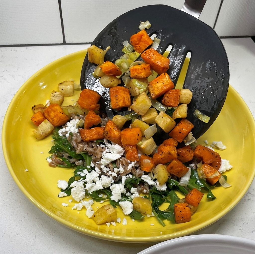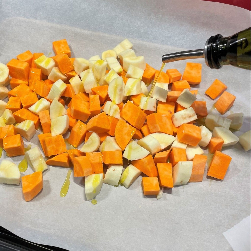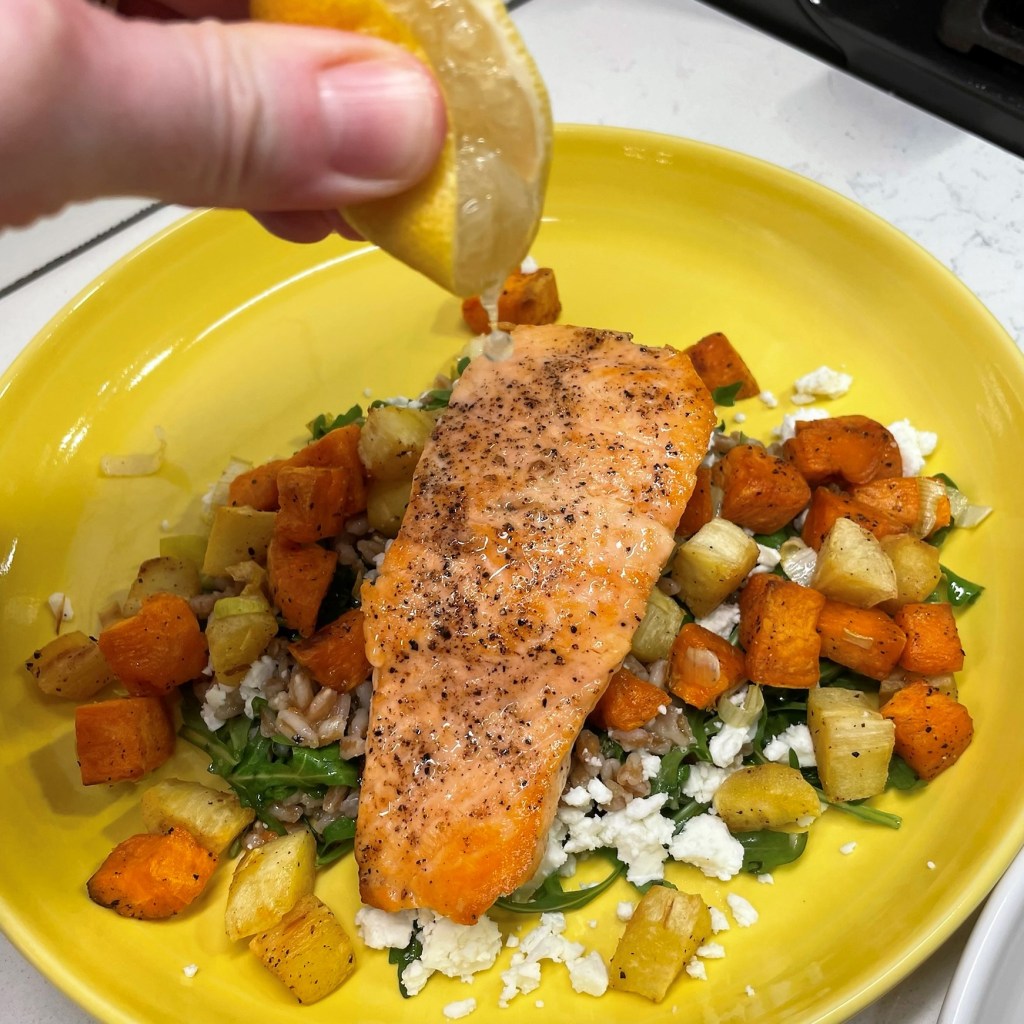 The rest of this recipe is straightforward and simple—the sweet potatoes and parsnips are tossed lightly in olive oil and roasted until tender and browned, and the salmon is lightly seared in a skillet with nothing more than salt and pepper. A quick vinaigrette of lemon, garlic and oregano ties the whole dish together with a fat handful of peppery arugula greens.