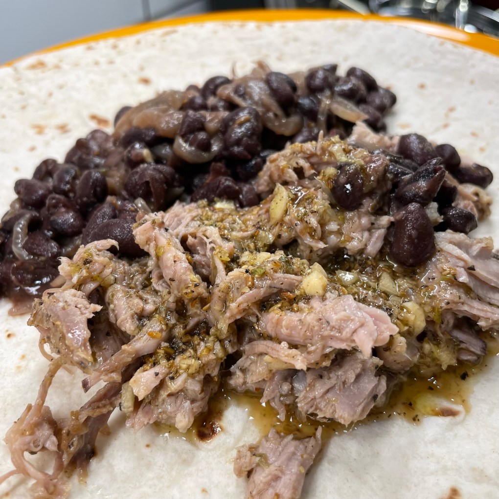 I cut half of a sweet onion into crescent slivers, and diced up a fresh jalapeno from our post-summer garden, leaving most of the seeds behind. I sautéed those in olive oil, along with a touch of ground cumin, then added two cans of rinsed black beans. Salt and pepper, and a splash or two of the Cuban-style pork braising liquid and we had a perfect, if not authentic, side dish for our delectable pork.