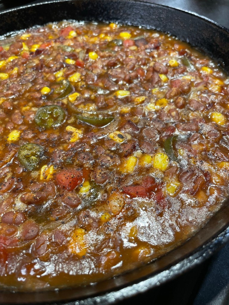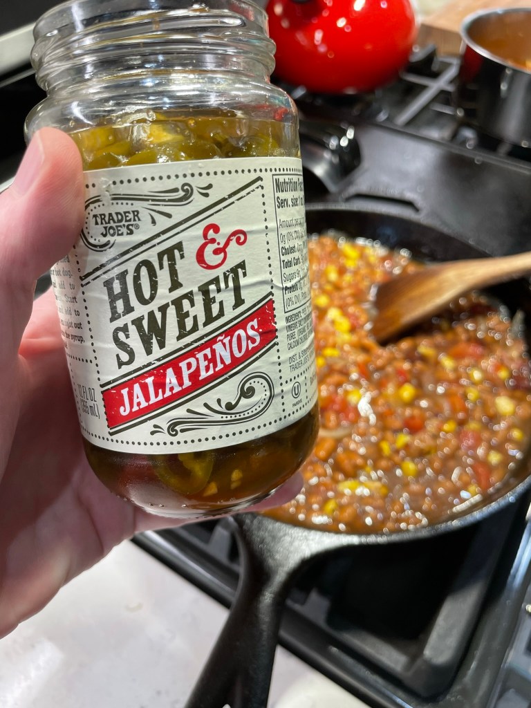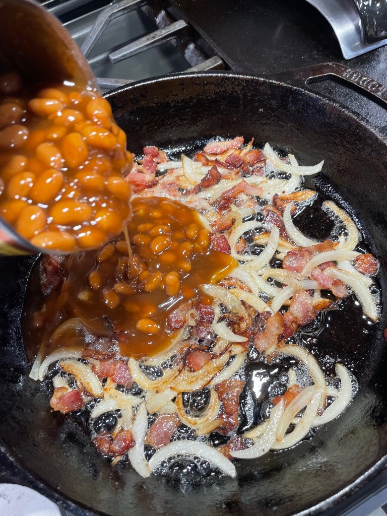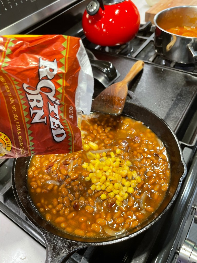 Alex’s choice left me with the enviable task of elevating the canned beans, which had a label touting “extra brown sugar.” I wanted something a little different, but not too crazy, so I started with onions and bacon— the two ingredients that always push baked beans into the savory zone. The canned beans had enough sweetness already, so I set my sights on texture and contrast. I tossed in some roasted corn (I used frozen from Trader Joe’s, but fresh would have been awesome) and about half a can of hot Rotel tomatoes, left over from a batch of Les’s amazing pimento cheese from a recent gathering of friends. For a huge kick of heat, I added a fat handful of sweet pickled jalapeño slices— also from Trader Joe’s— and I didn’t bother to drain or chop them. The only other seasoning I added was salt and pepper. Sooo easy!
