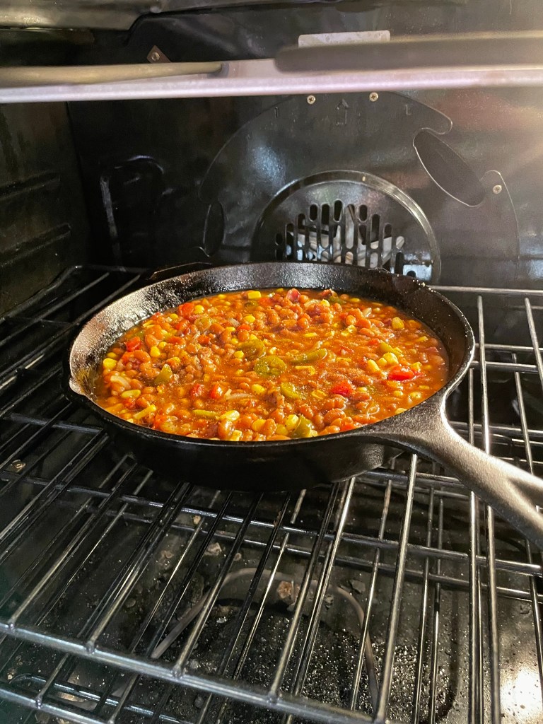 5. Transfer skillet to preheated oven and bake 45 to 50 minutes, until beans are bubbling around all the edges of the skillet. Allow the beans to cool about 10 minutes before serving.