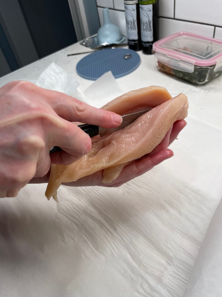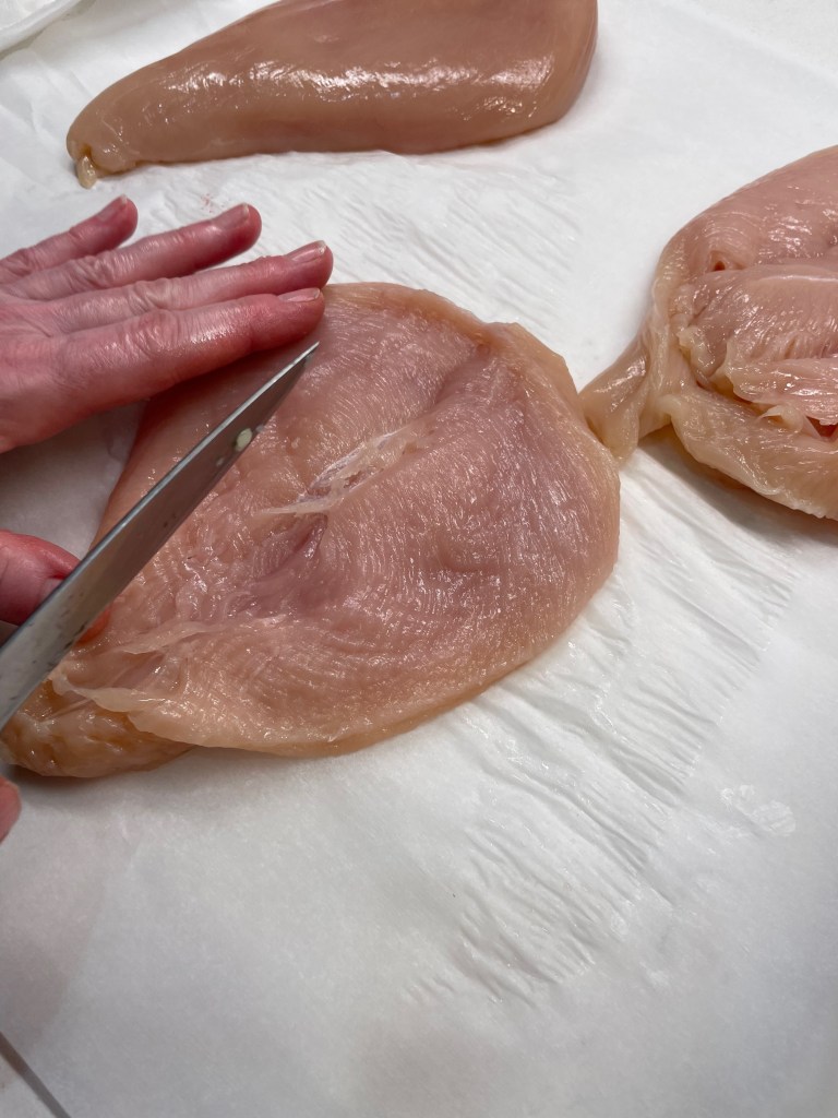 Stuffed chicken breasts are easy to do, but there are a few steps involved for easy rolling. First, you want the chicken to lay flat, so use a sharp paring knife and a slow, gentle touch to gradually open up the long side of the breast like a book. Next, place them between layers of parchment or waxed paper and pound them with the flat side of a meat mallet until the chicken is about 3/8-inch thick. It should look similar to a heart shape.