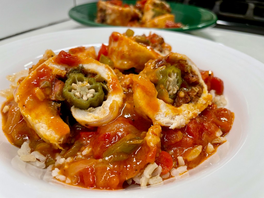 A quick dusting of flour ensured even browning on my roulades, and then I covered and smothered them with the Creole sauce, baking it with a foil cover for about 40 minutes. My kitchen smelled amazing! I carefully lifted the roulades to a cutting board, sliced them up and served on brown rice with the Creole sauce.