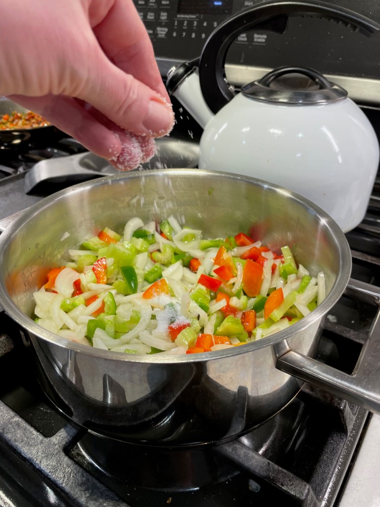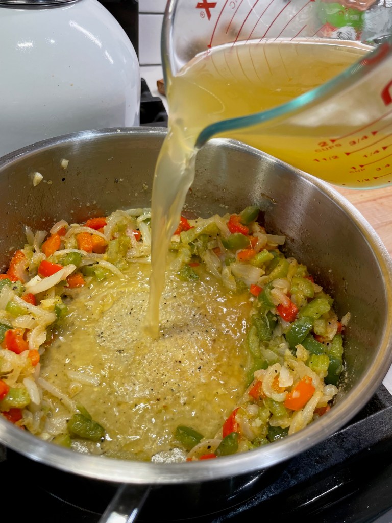 2. While the diced veggies are cooking, heat a medium sauce pot over medium heat. Add olive oil and chopped vegetables. Season with Cajun garlic seasoning and cook until softened, adding garlic near the end of cooking. Spoon flour over the vegetables and toss to cook until the roux coats and sticks to the pot.