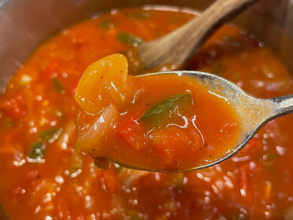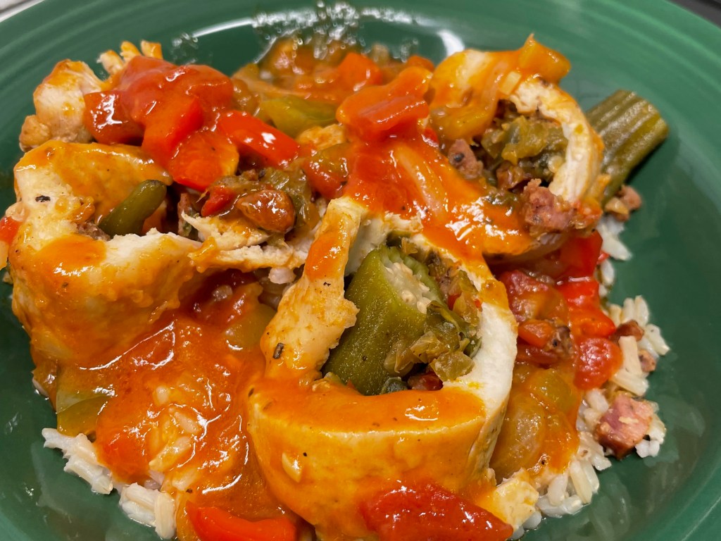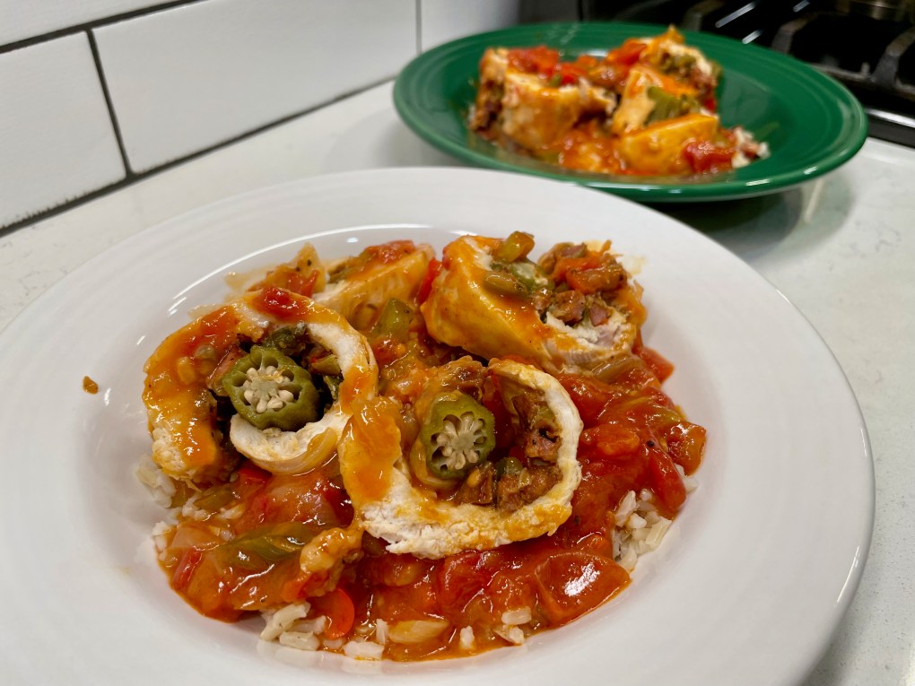 As I was working on this dish, and especially the Creole sauce, an old memory hit me that may explain my fascination with the foods of New Orleans, despite having never had the chance to visit. When I was a teenager living in Colorado with my mother, I bused tables for Sunday breakfast and early lunch at a Best Western dining room. My job, in addition to clearing dirty dishes and resetting the tables with white tablecloths, included running hotel pans of hot food from the kitchen to replenish the buffet. I can still picture how I learned to carry the terribly hot stainless steel pans, balancing two opposite corners on the heels of my hands so that I didn’t get burned. One of the dishes that was served frequently as my shift turned toward lunch was “veal Creole,” and I was mesmerized by the sauce. It was tomato-forward, but decidedly not Italian as most sauces I was familiar with. There was something special about it, and I’m certain that it added color to my imagination about other New Orleans cuisine. For sure, I have to put NOLA on the short list of places to visit soon!