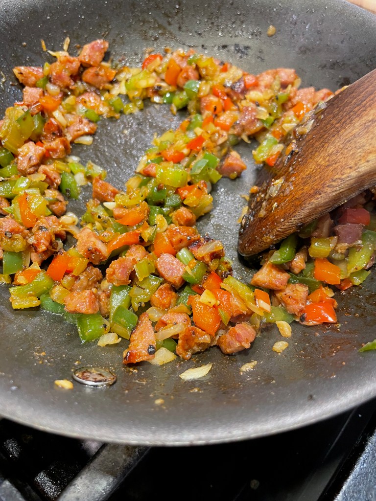 1. Heat a small skillet over medium heat. Add the diced andouille sausage and cook until the edges are crisped and fat is rendered. Add the diced onions, peppers and celery and sprinkle with Cajun garlic seasoning. Cook until vegetables are tender and reduced, adding half of the garlic in the last couple of minutes. Set aside to cool.
