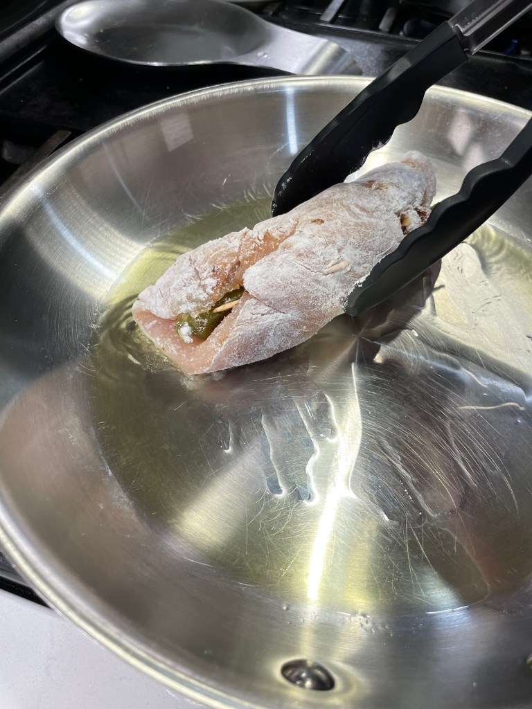 Finally, it was time to assemble and bake my roulades! There was one more flavor element that I wanted in my “rearranged” jambalaya, and that was okra. My husband is not a fan of this much-maligned southern staple vegetable, which can sometimes be slimy when cooked. Here’s how I got around that unpleasant trait— I used spicy pickled okra! The process of pickling keeps the okra firm and sturdy, and the sweet-sour pickling added a nice flavor accent to my roulades. I cut lengthwise slits in each okra pod so that I could release the excess liquid onto paper towels, and then I rolled up my andouille-layered cutlets with the okra inside and tucked in a few toothpicks to hold them together.