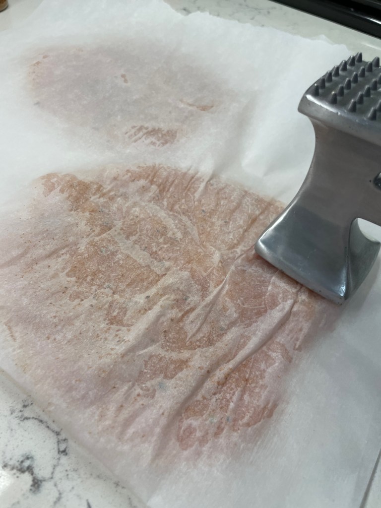 • 2 large boneless, skinless chicken breasts, butterflied and pounded to 3/8″ thickness