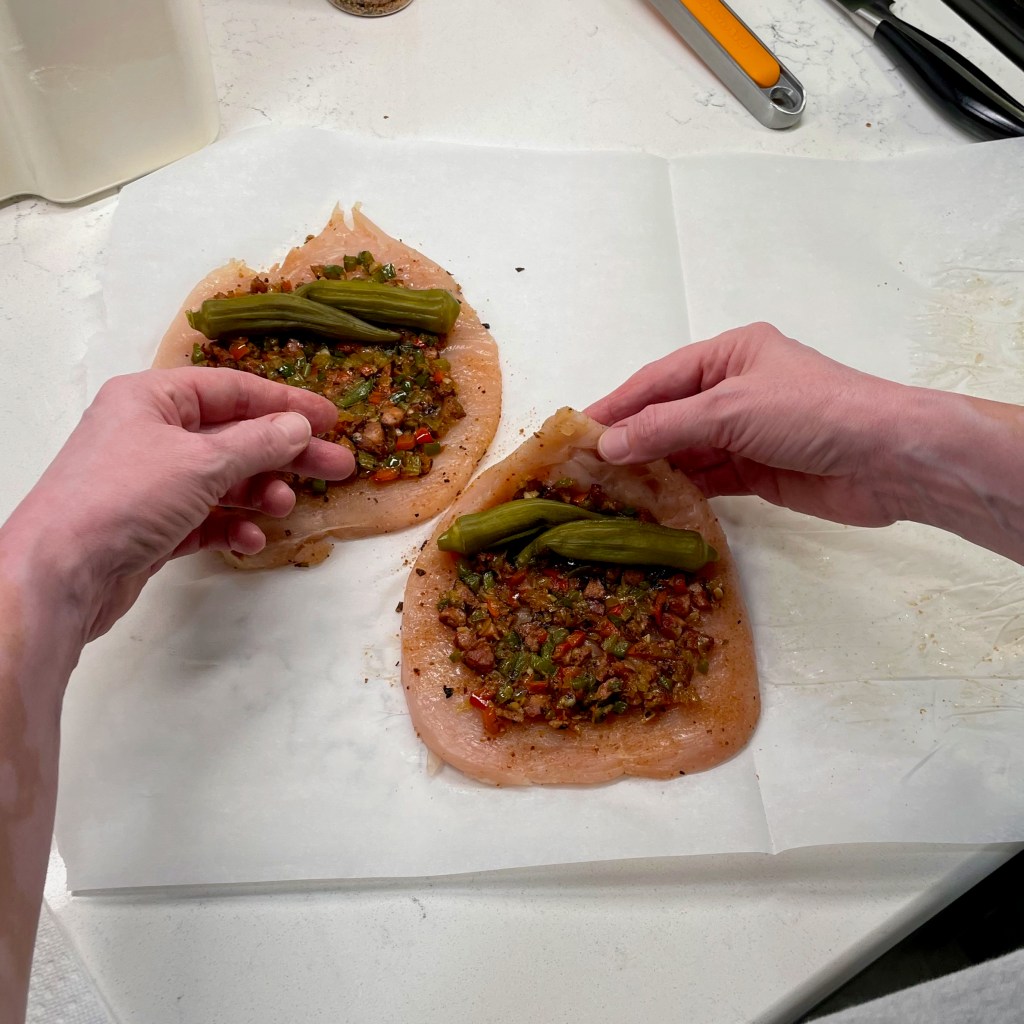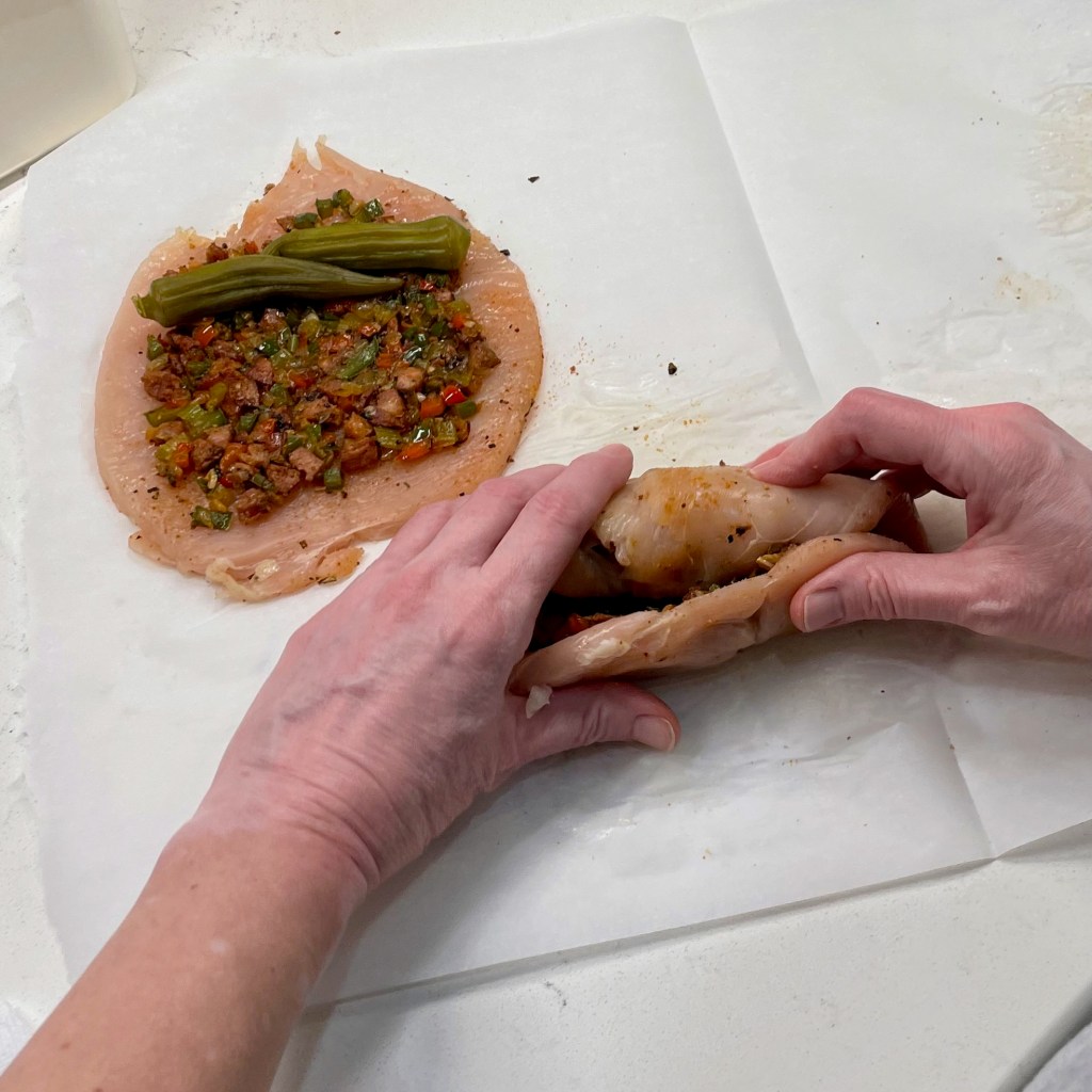 4. Preheat oven to 350° F. Assemble the roulades by dividing the andouille-trinity mixture evenly over the butterflied chicken breasts. Place two okra pods at the narrow tip of the cutlet and roll snugly toward the larger end. Secure the loose ends with toothpicks.