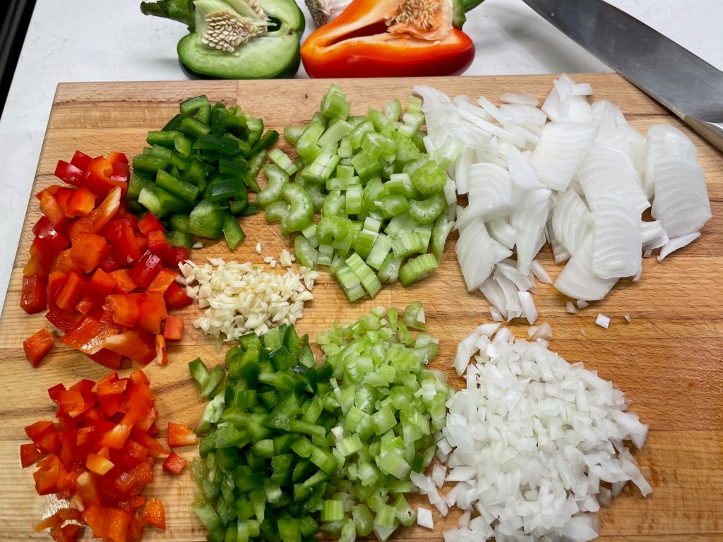 The prep work is my least favorite step of cooking, but it is so important to have things lined up and ready to go. The French call this principle mise en place, and it seems especially apropos to apply here, given that Creole food is drawn from French inspiration. You’ll see that I’ve packed a ton of vegetables into this dish— bell peppers, onions and celery (known in Louisiana kitchens simply as “the holy trinity”), plus a few cloves of minced garlic. The chopped veggie bits will end up in a Creole sauce, and the diced pieces will fortify the andouille filling of my roulades.