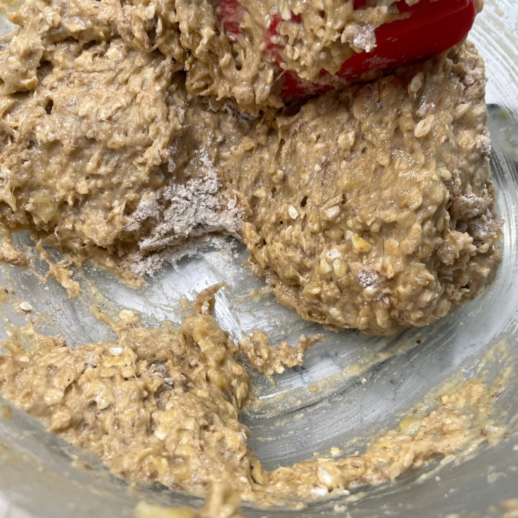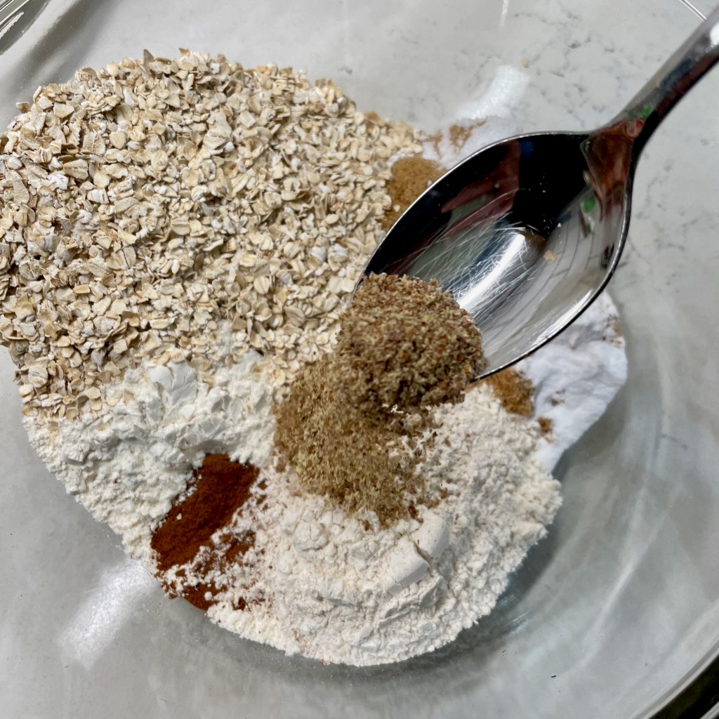 - In a medium bowl, stir together the flours, oats, brown sugar, baking powder, soda, salt, cinnamon and flax meal.