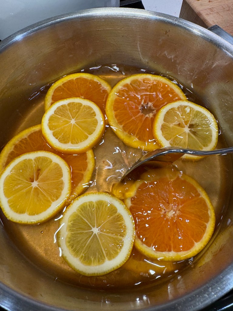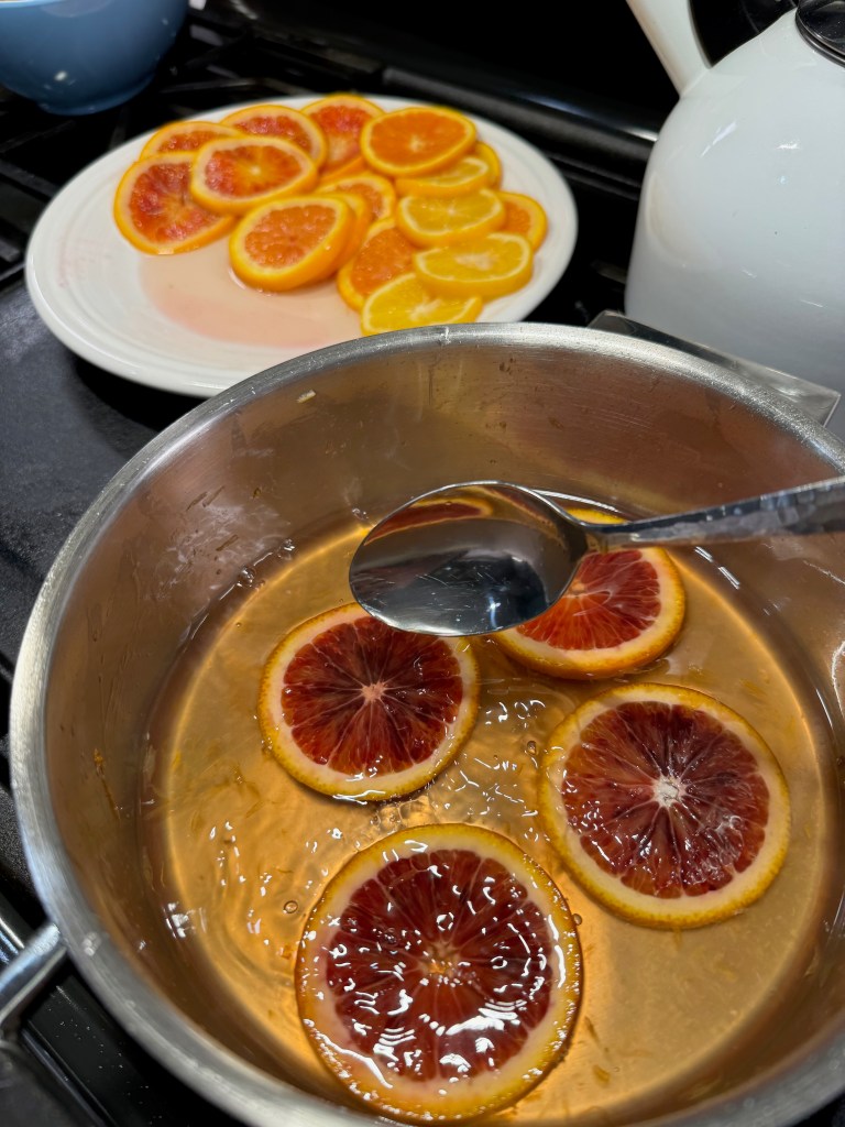 Simmer the lighter colored citrus to your simple syrup first! I discovered quickly how much the blood oranges gave off their brilliant color, and to prevent them staining the lighter slices, I pulled them off to a plate, finishing the simmering in stages. This took about 45 minutes total, and I feel quite sure that you could tackle this task a day ahead to save preparation time on baking day— but bring the orange slices back to room temperature before you bake. Do not discard the leftover syrup!