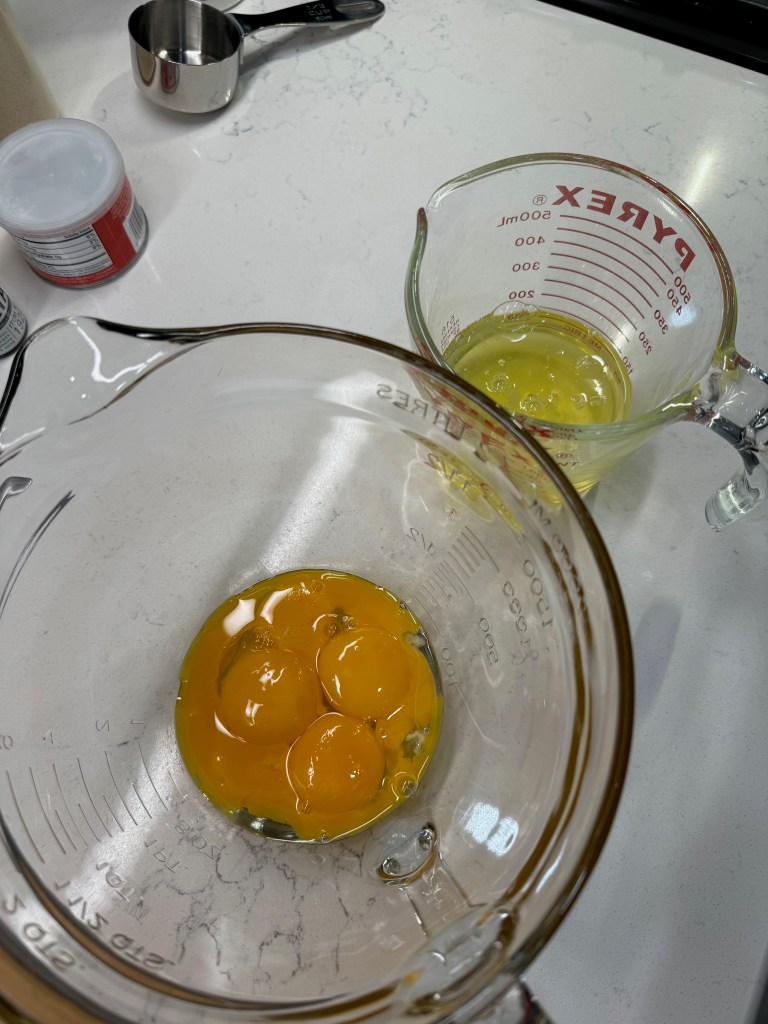 - 5 eggs, separated (do this when eggs are cold)