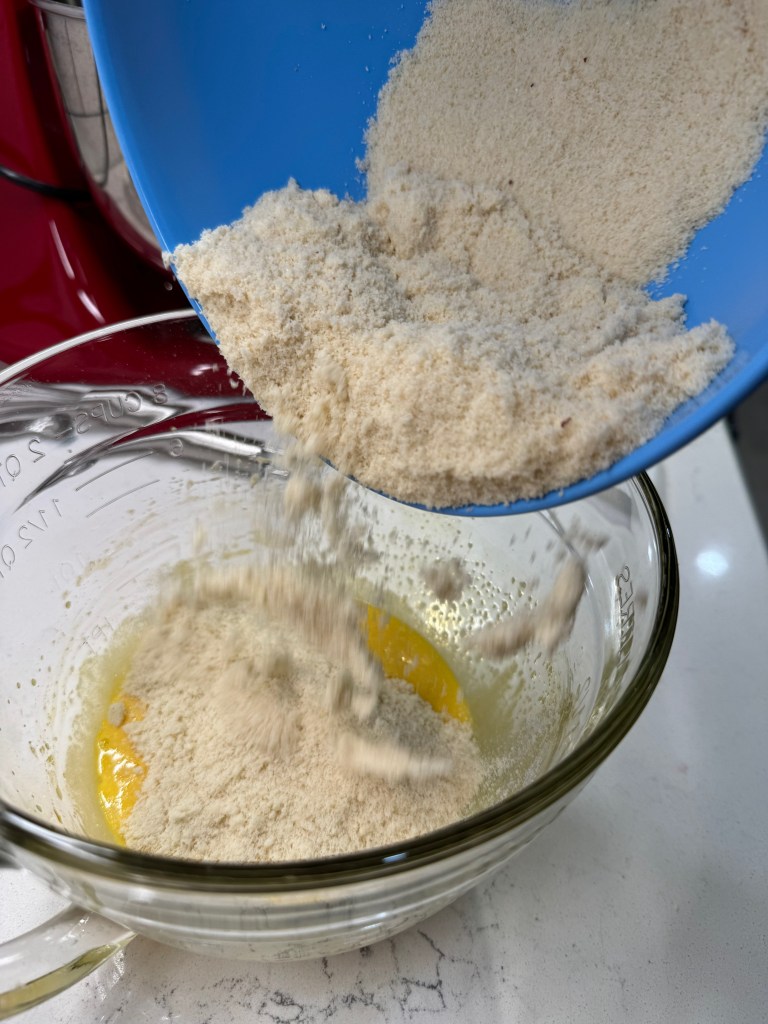 - In a medium bowl, whisk together almond flour, baking powder and salt. Add this mixture in batches to the egg mixture and beat until evenly combined. It will be a dense, almost paste-like batter.