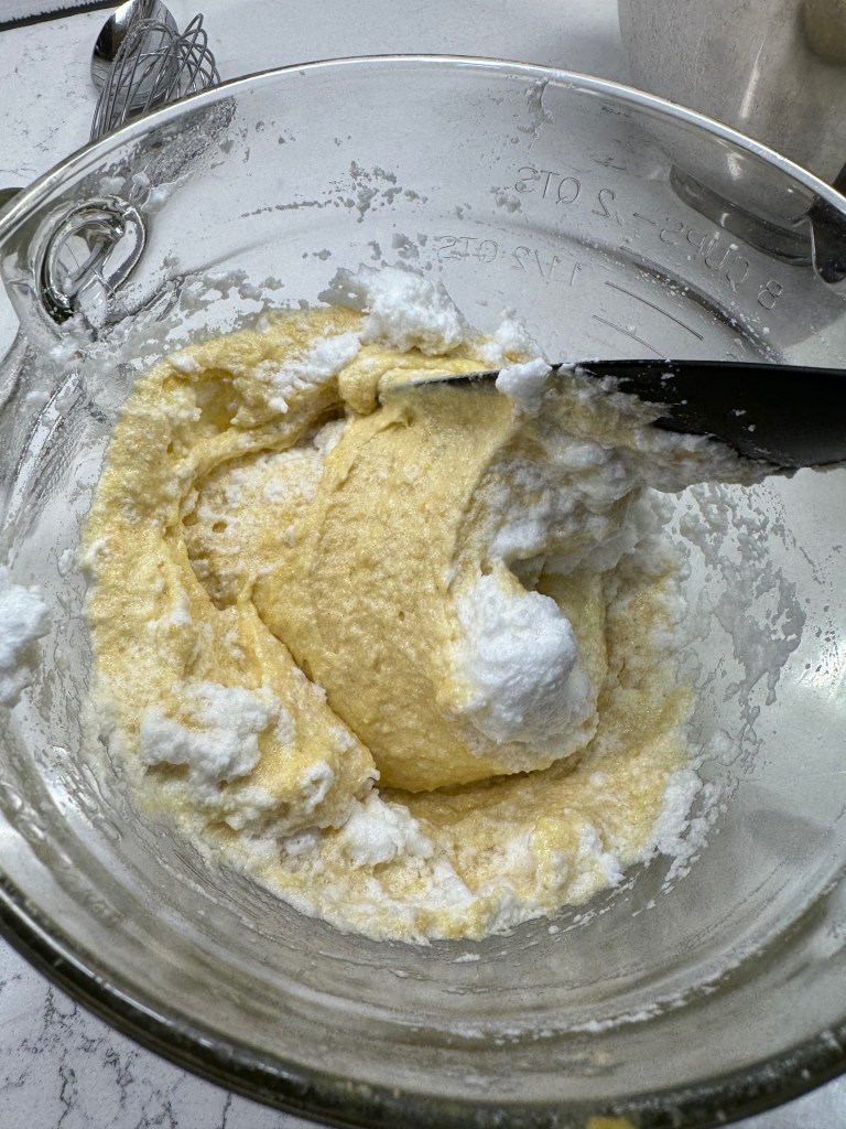 - Gently fold the whipped egg whites into the dense batter, beginning with only 1/2 cup and gradually adding more. It will feel impossible at first, but after the first two additions of whipped egg whites, it will become easier and smoother.