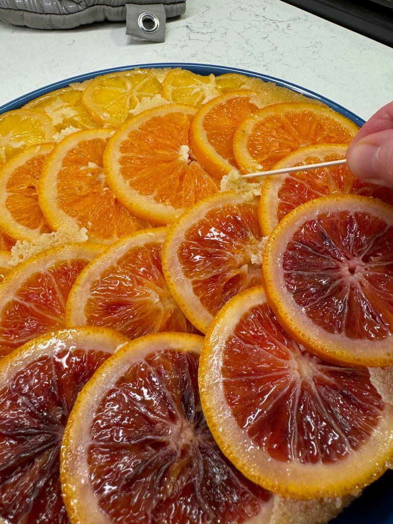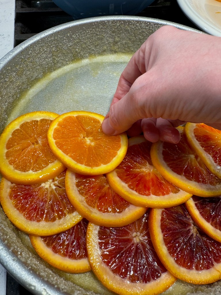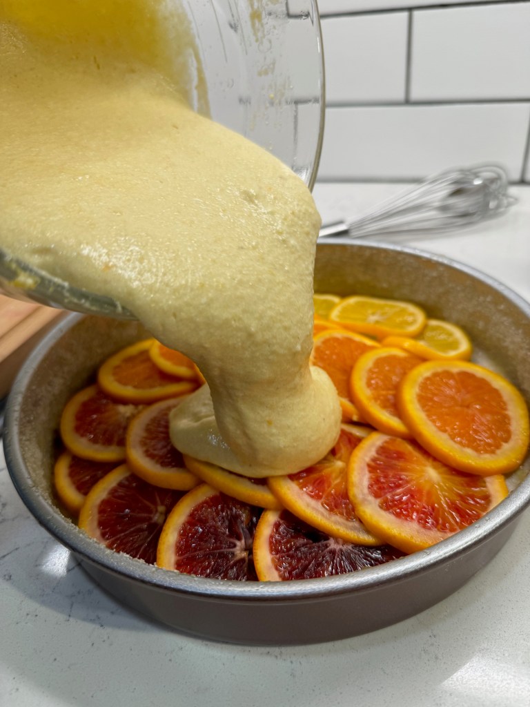 Finally, for preparation of the pan, use a fitted round of parchment paper in the bottom, to ensure that the thin citrus slices don’t stick and cause a problem. Spray the pan with olive oil spray and sprinkle sugar into it before carefully layering your citrus, overlapping tightly and completely so that no batter slips underneath.