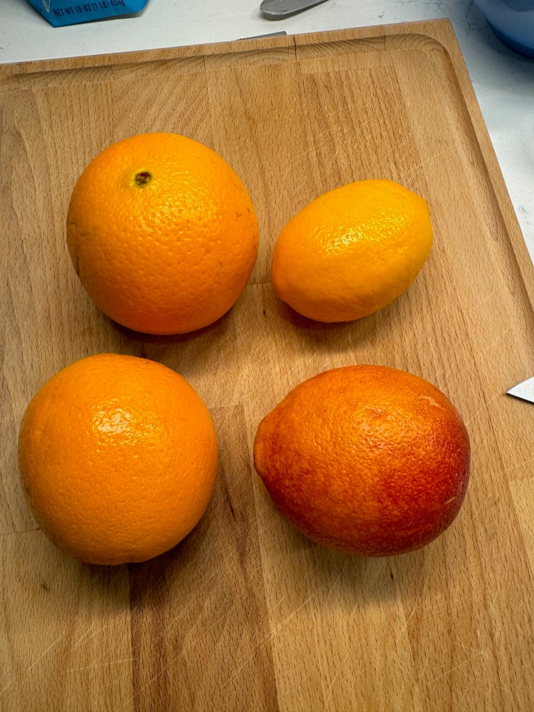 First, choose citrus fruits that are similar in size, so that overlapping the slices in the cake pan is easier and more uniform. One of my oranges was quite large and I found it tricky to make the layers work. I used two blood oranges (I got lucky with two different colors!), two cara cara oranges and a large Meyer lemon.