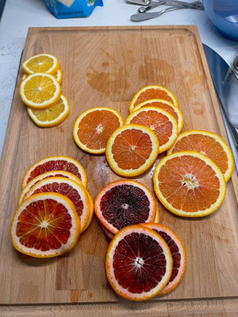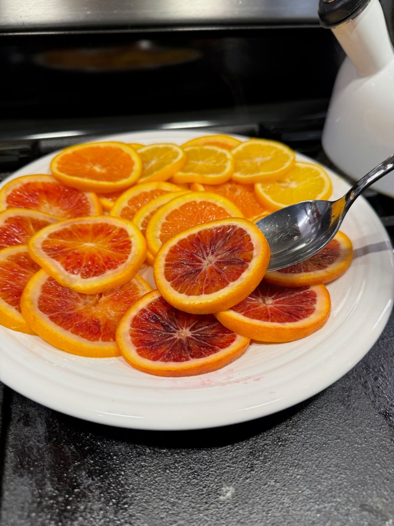 You’ll be eating the peel, so organic is best, and be sure to gently wash the citrus in warm, soapy water first— yes, you heard me. Wash the citrus with soap, and then rinse and dry it before slicing. You’d be shocked at the amount of dirty water I poured down the drain after this step. Use a dish detergent that has no fragrance.