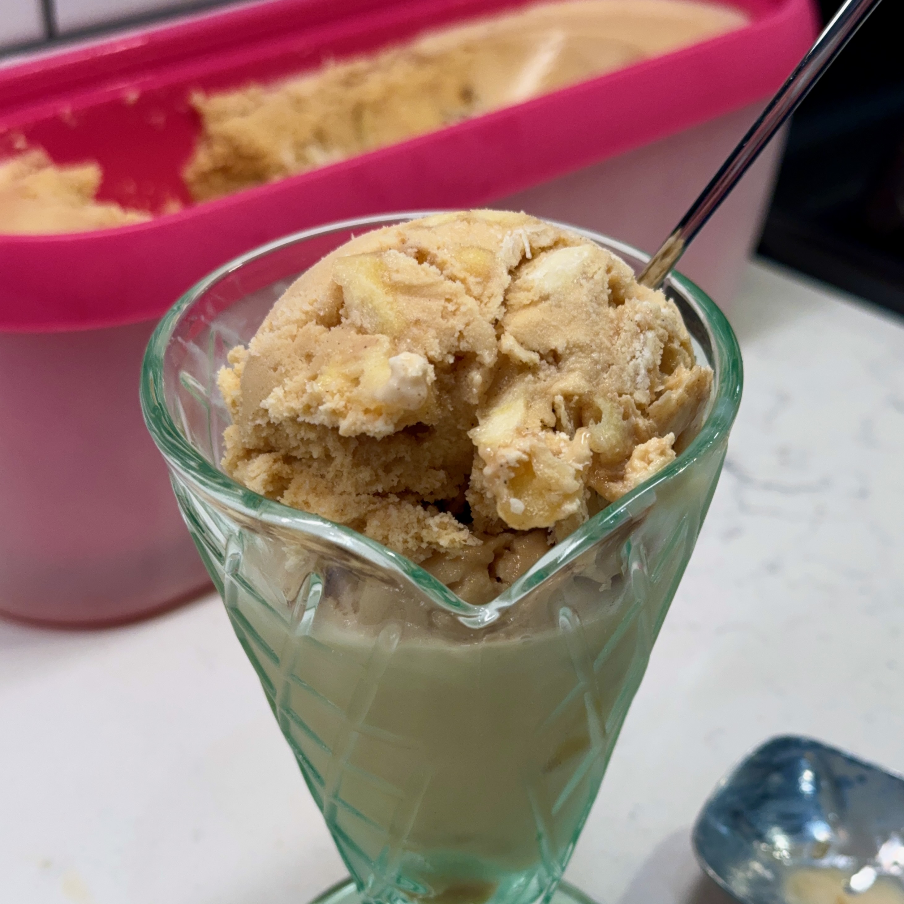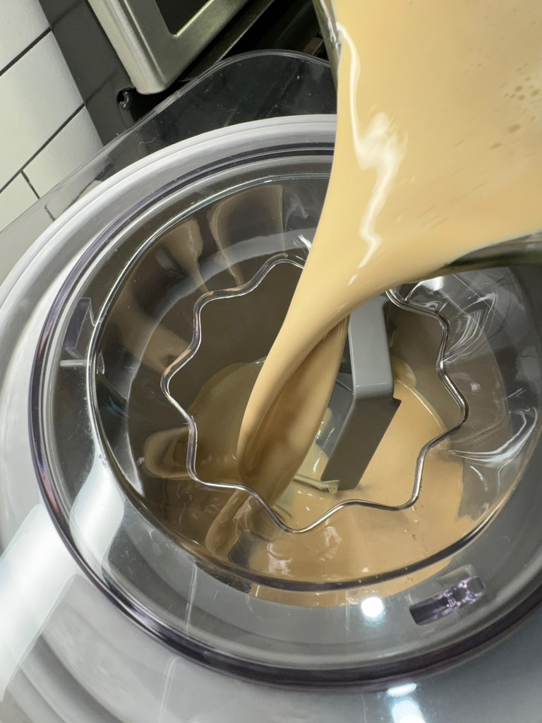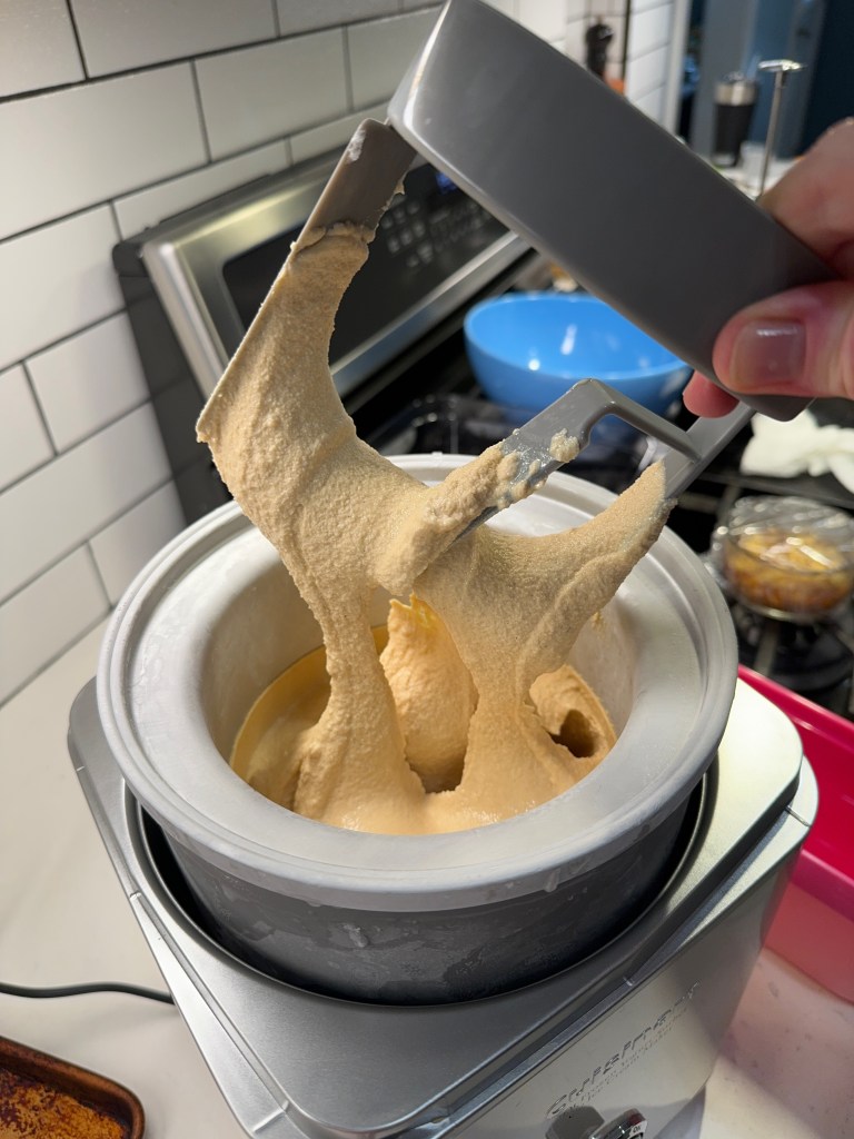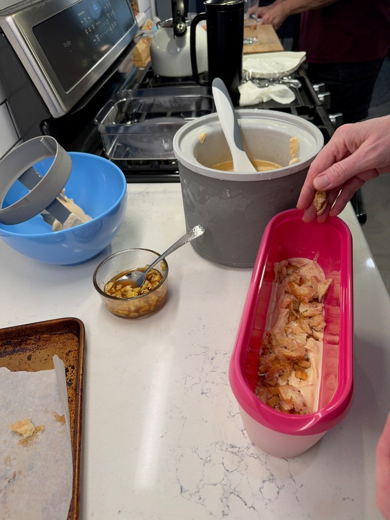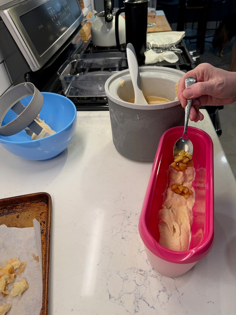 4. Churn the dairy base in ice cream machine, following manufacturer’s instructions. If using vodka for texture, only add it during the final minute of churning. Transfer ice cream to an insulated freezer container, layering with stewed spiced apples and torn bits of frozen turnover. Ripen in freezer several hours (overnight is best).