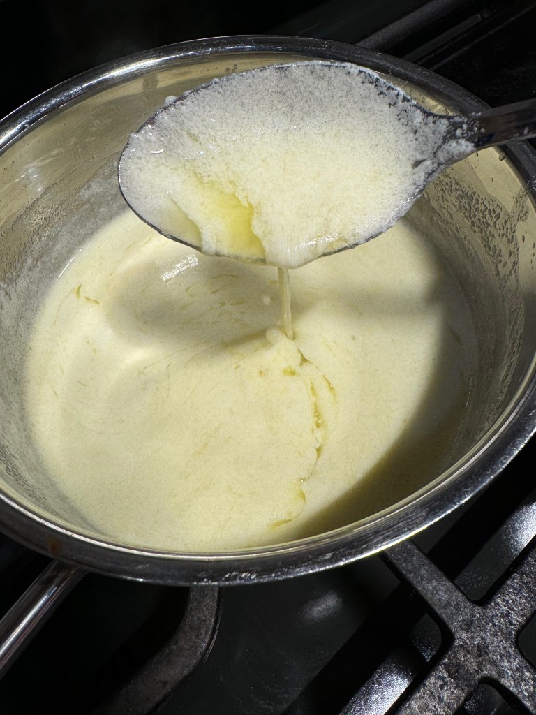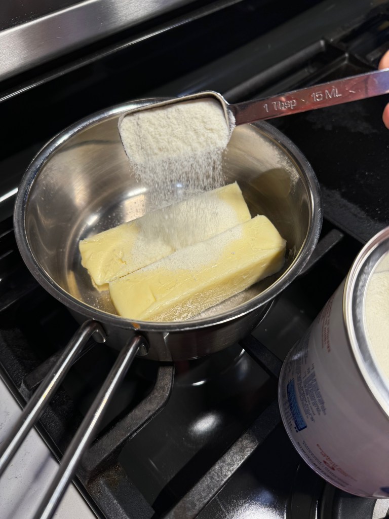 - Place the butter in a heavy-bottomed sauce pan over medium heat. Stir frequently, and when melted butter begins to brown, add the dry milk powder. Stir constantly, as the browning will happen quickly at that point. Remove from heat as soon as the butter reaches a copper color. Transfer to a measuring cup to cool.