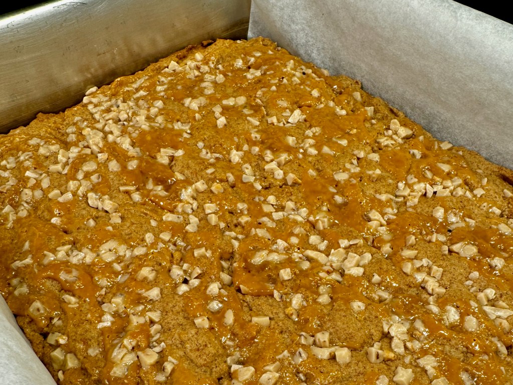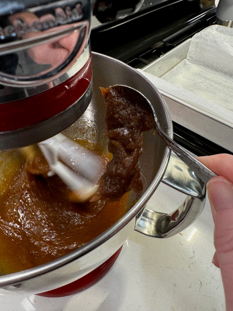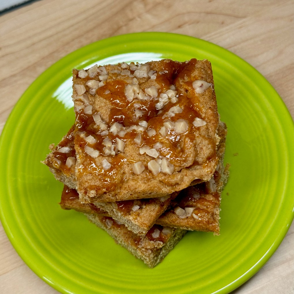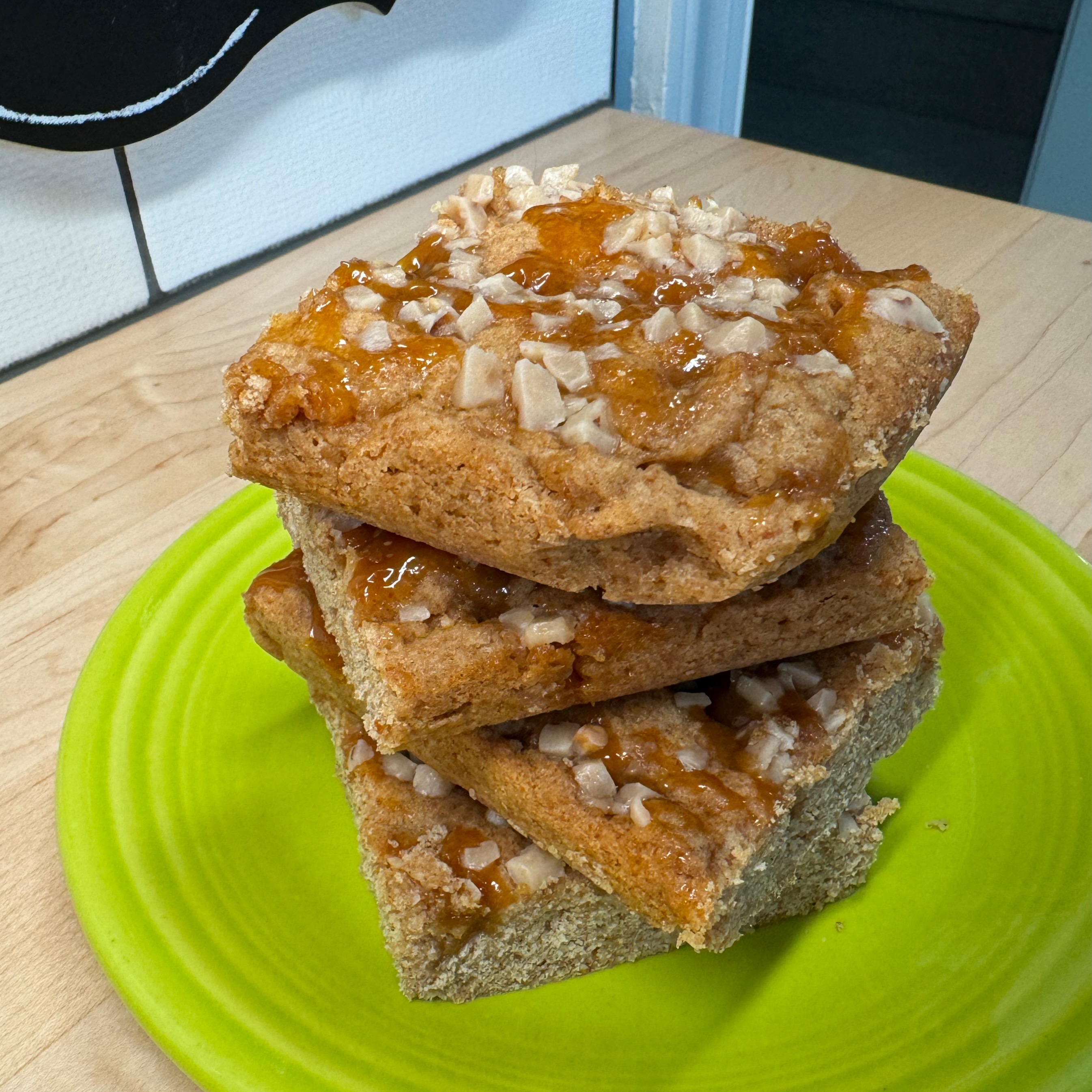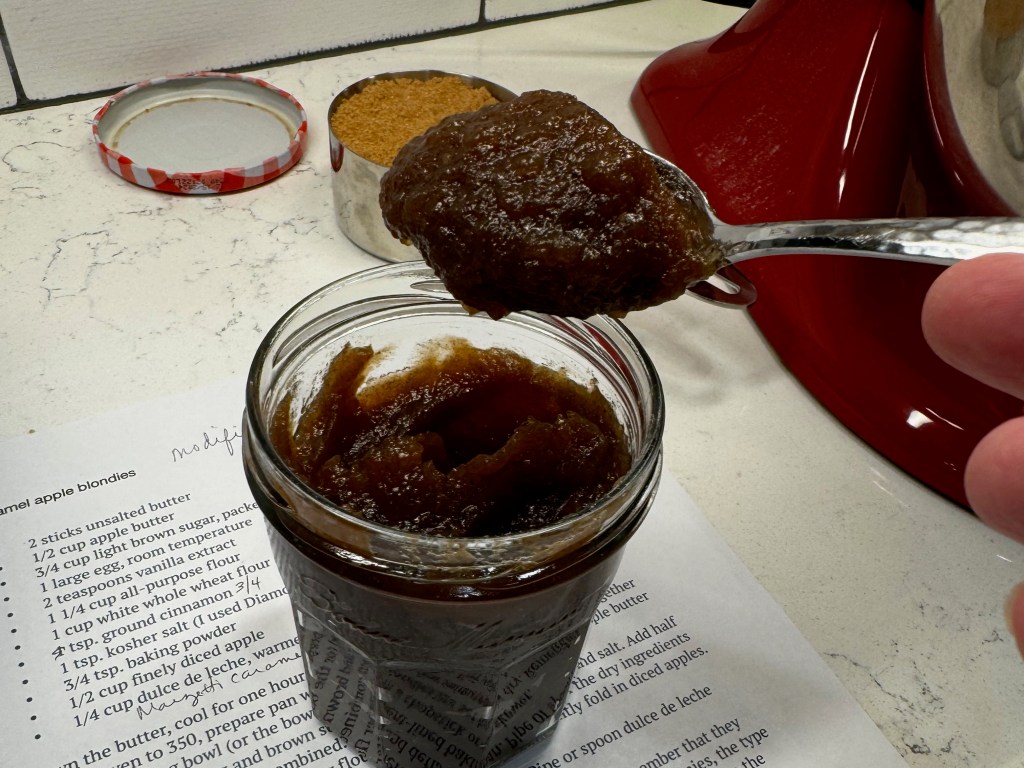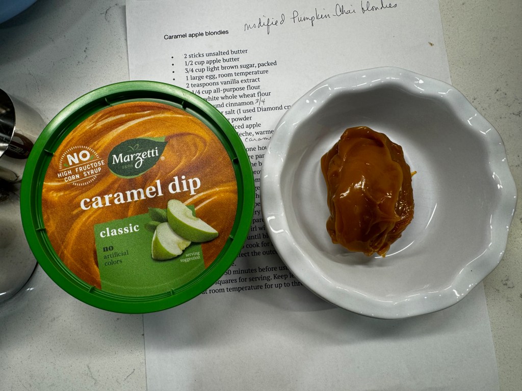 For this recipe, I’ve leveraged the same technique as in last year’s pumpkin chai blondies, using a concentrated paste of cooked down apples this time— otherwise known as apple butter— to give a distinct apple flavor without the high amount of moisture that would have been in fresh chopped apples. The caramel element is an easy grocery store item, the same stuff you pick up in the produce department for dipping apple slices.