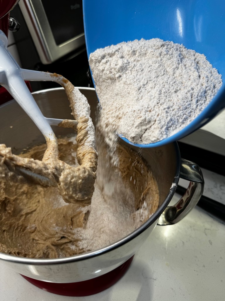 - In a medium bowl, whisk together flours with cinnamon, baking powder and salt. Add half the flour mixture to the apple mixture, folding just until all the dry ingredients are incorporated. Repeat with remaining flour blend. The batter will be very thick and dense.