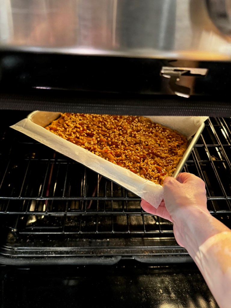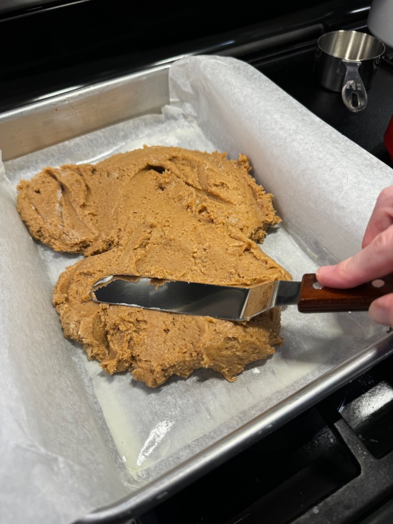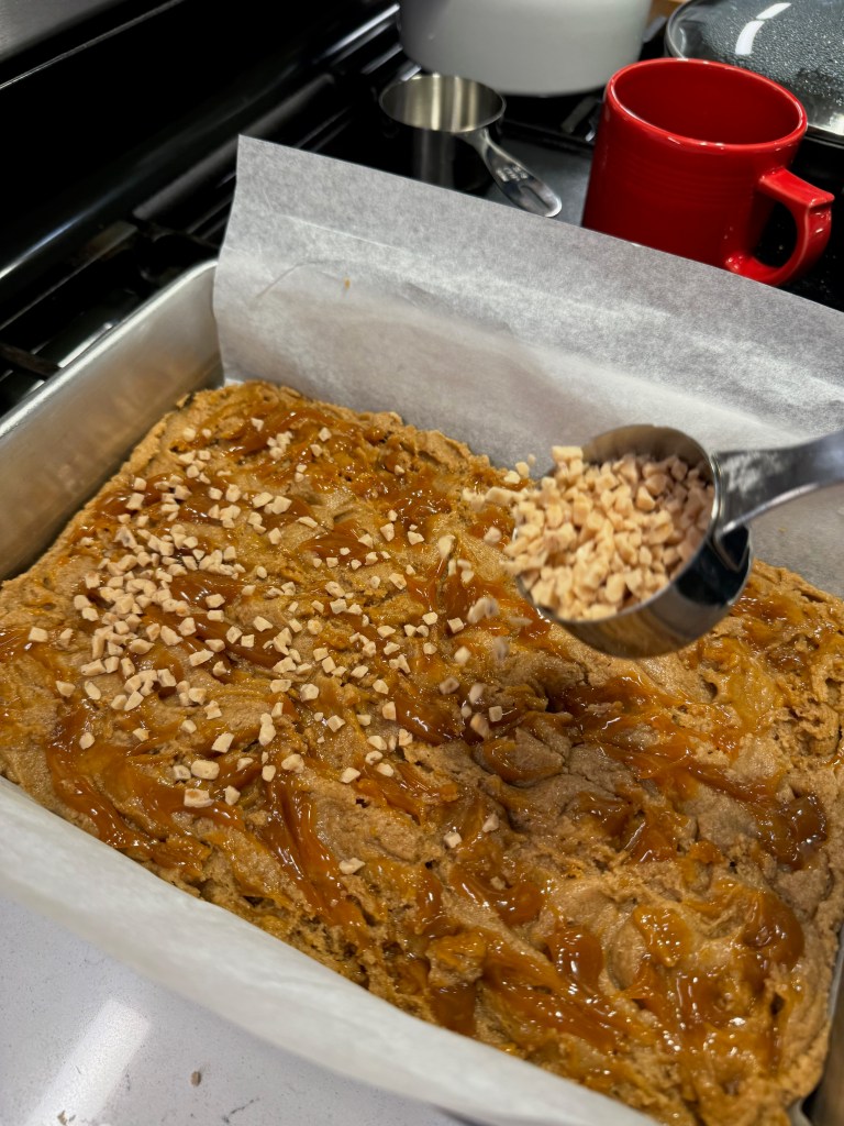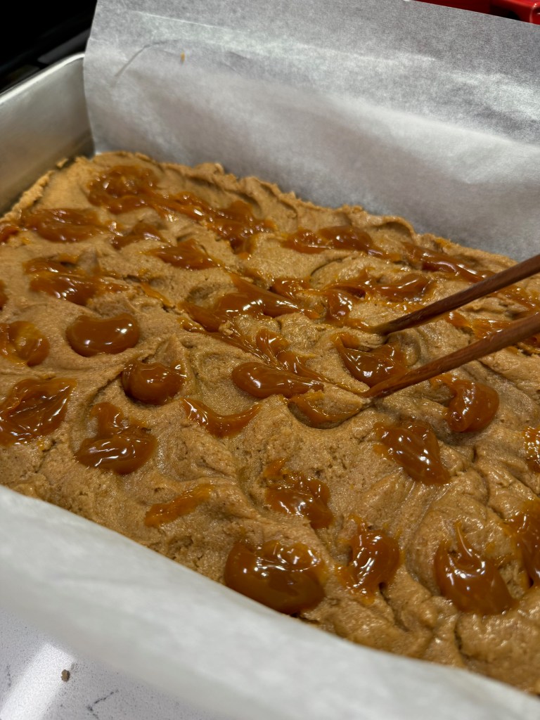 Spread the batter evenly into a buttered, parchment-lined pan, then spoon and swirl a bit of warmed caramel dip over the top. Scatter a few tablespoons of Heath candy bits on top and bake until the blondies test done with a clean toothpick.