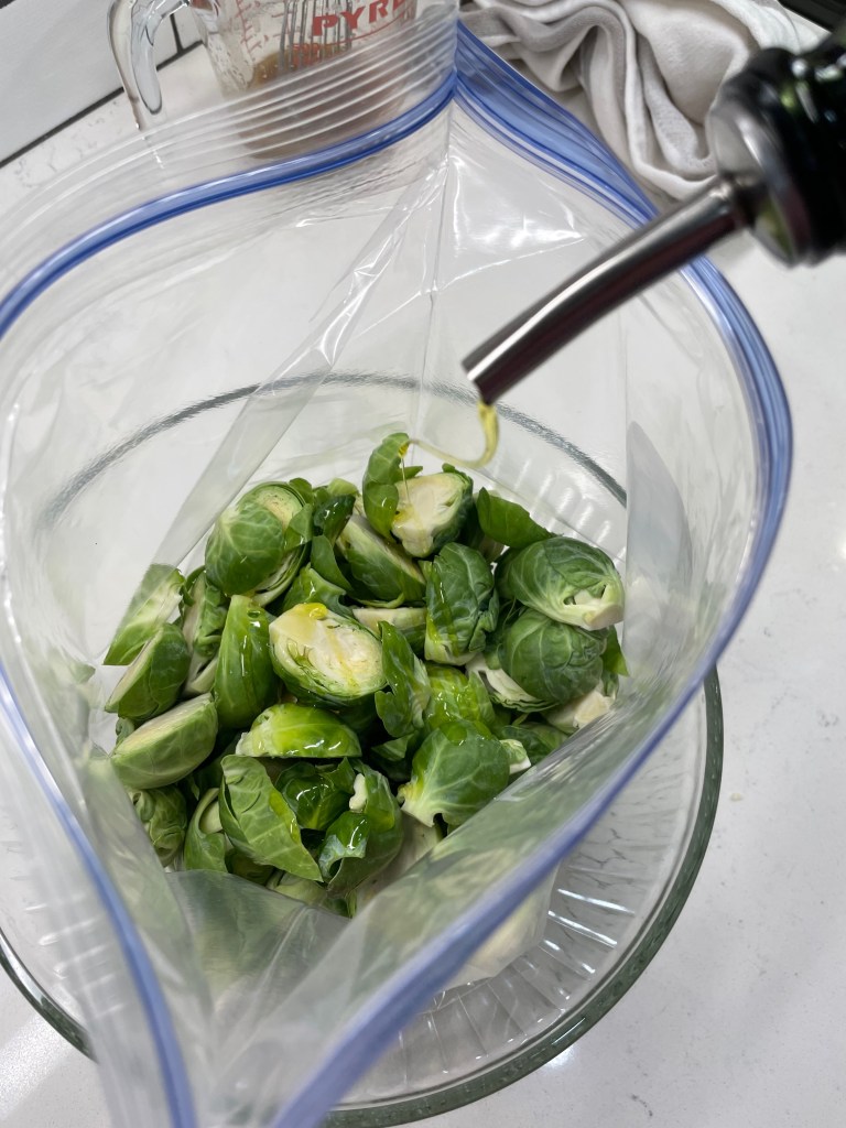 4. Transfer the sprouts to a large bowl or zip-top bag and drizzle with a tablespoon of olive oil. Toss to coat, and arrange them, cut side down, on one of the baking sheets. Sprinkle with kosher salt and give them a few twists of freshly ground pepper.