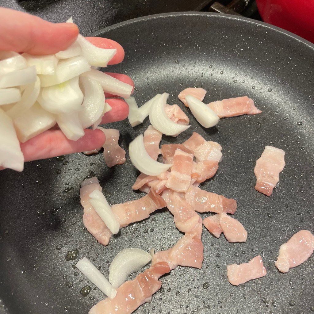 2. Heat a heavy skillet over medium heat. Cook bacon and onions together until bacon is just crispy and onions are somewhat tender and browned. Remove from heat and set aside.