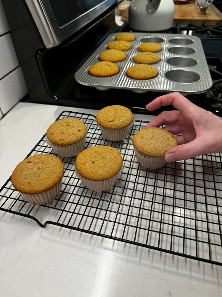 As an aside, do you see what my KitchenAid did with the zest? I guess it’s best to stir that in by hand at the end! Divide the batter evenly among the cupcake liners and bake, then cool for a bit before transferring them to a wire rack.