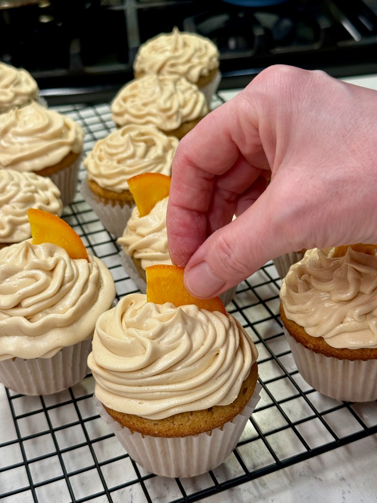 Decorating the cooled cupcakes is easy as well, and if you don’t have a piping bag with a star tip, don’t sweat it. Load up a zip-top bag and snip the corner. Or go old school and swirl a massive amount on with the back of a spoon. Just keep a stack of extra spoons on standby because, no matter how restrained you think you are, you’ll be licking them. Add the candied oranges and cherries when you’re ready to serve. Cheers!