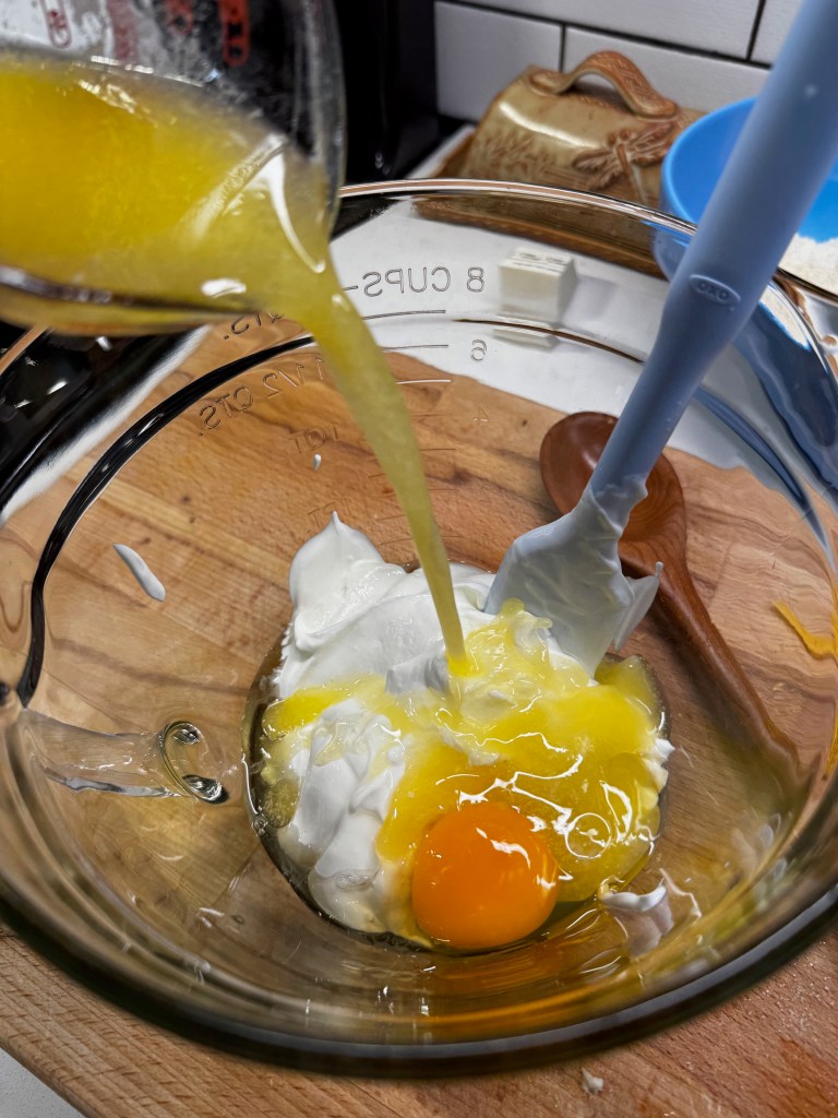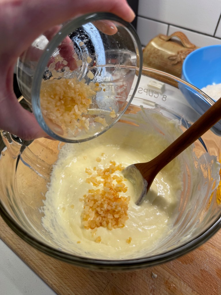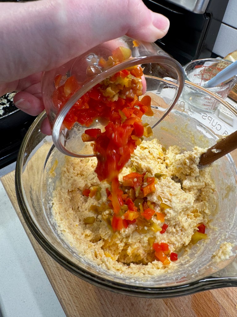 Les loves spicy foods, so along with pimentos, I subbed in some hot cherry peppers, which made for a nice flavor kick. I only had a bit of sour cream, so I went halvsies with plain Greek yogurt. I’m grateful that the two are almost always interchangeable, but in this case, I had a very heavy batter so I splashed in a bit of buttermilk, too. It’s good to be able to pivot in the kitchen!