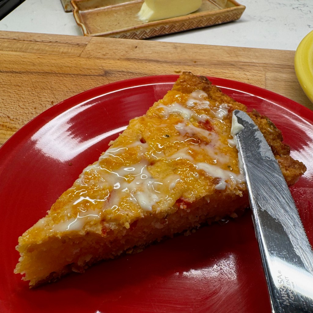 This cornbread smelled amazing when I pulled it from the oven. The cheddar melted throughout, and the pimentos and hot cherry peppers gave the whole thing a “pimento cheese” vibe. The only thing I plan to do differently next time will be trade the melted butter for mayonnaise, which will serve the same purpose and bring it even closer to true pimento cheese.
