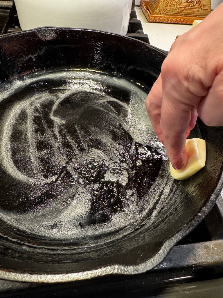 - Preheat oven to 375° F, with rack in center position. Place a 10-inch cast iron skillet over medium-low heat and add cold butter, rubbing the butter along the side of the skillet to grease it. Keep the skillet on low heat while you prepare the batter.
