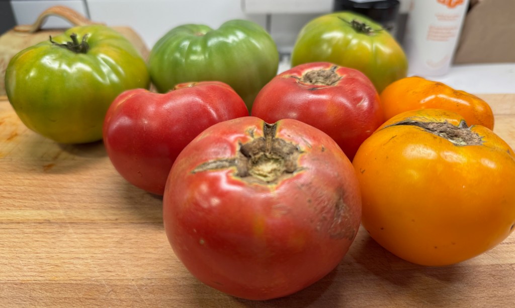 Some decisions come back to bite you. I know this because I have really missed having fresh-off-the-vine tomatoes and zucchini this year, and I’ve felt twinges of regret over having ripped out my deer-ravaged garden a couple of summers ago. I just didn’t have it in me anymore, but at least we have the farmers’ market. I recently invited a neighbor to join me at our fabulous Saturday market, and I brought home a few fresh tomatoes as well as some green ones.