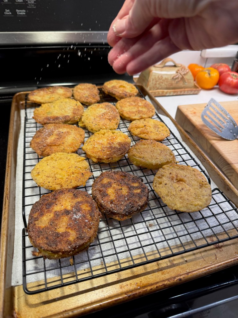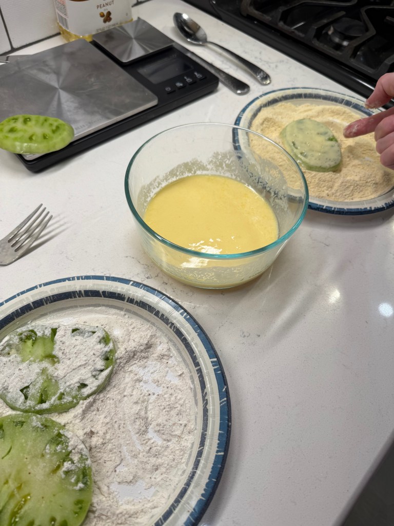 Confession time: I had never made these before, and so I was relying mostly on a recipe from Southern Living magazine as well as my own memories of having eaten fried green tomatoes at some of our local hot spots. The trick, apparently, is to use tomatoes that are truly green, freshly picked off the vine or farm stand while still firm and solid. This is necessary because frying won’t work on softer, juicier tomatoes. I bought my tomatoes on a Saturday, and by the time I got my proverbial ducks in a row on Tuesday, two of my maters were already headed toward varying shades of pink, but they worked out fine.