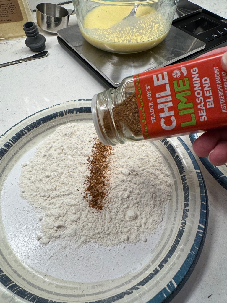 Because I wanted to marry these fried green tomatoes with Mexican street corn, I took the liberty of seasoning every layer of my dredging station. This meant a couple of dashes of local hot sauce into the buttermilk mixture and a few shakes of Trader Joe’s “Chile Lime” seasoning into both the flour and cornmeal mixtures.