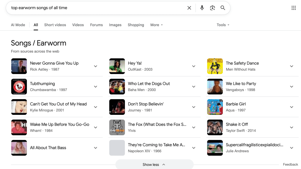 You know the drill when a song gets stuck in your head and certain parts of it play over and over and over, driving you nearly mad? It might be a song you love or one you hate, or maybe even one that you love to hate, and sometimes (but not always) its sudden appearance in your mind is triggered by something someone says or perhaps a TV commercial or a fleeting memory. Or it could just be completely random. In any situation, it drives me nuts, and the only method I’ve found for releasing it is to lean in. I search out the offensive song on Spotify and actually play it. Singing it loudly seems to help as well, and then I can get on with my life.
