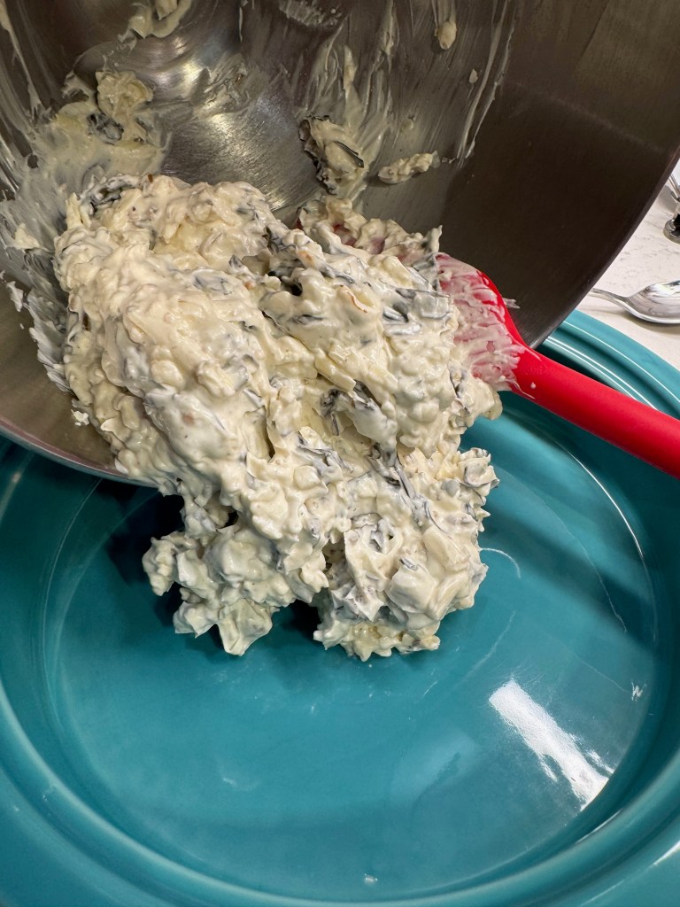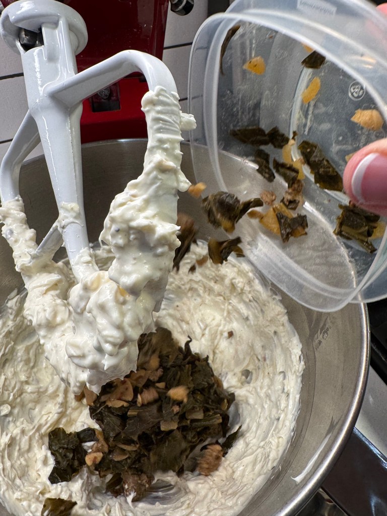 This recipe begins as all of my creamy dips do, with a brick of cream cheese, some mayonnaise and a bit of sour cream. This combination creates a smooth, creamy base that is neither too heavy nor too oily. This collard dip called for bold flavors, so I tossed in some minced garlic and crushed red pepper seasoning, then I blended it into a creamy concoction in my stand mixer.