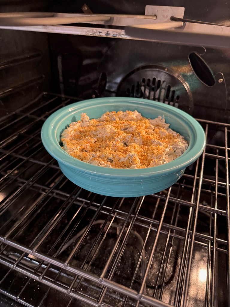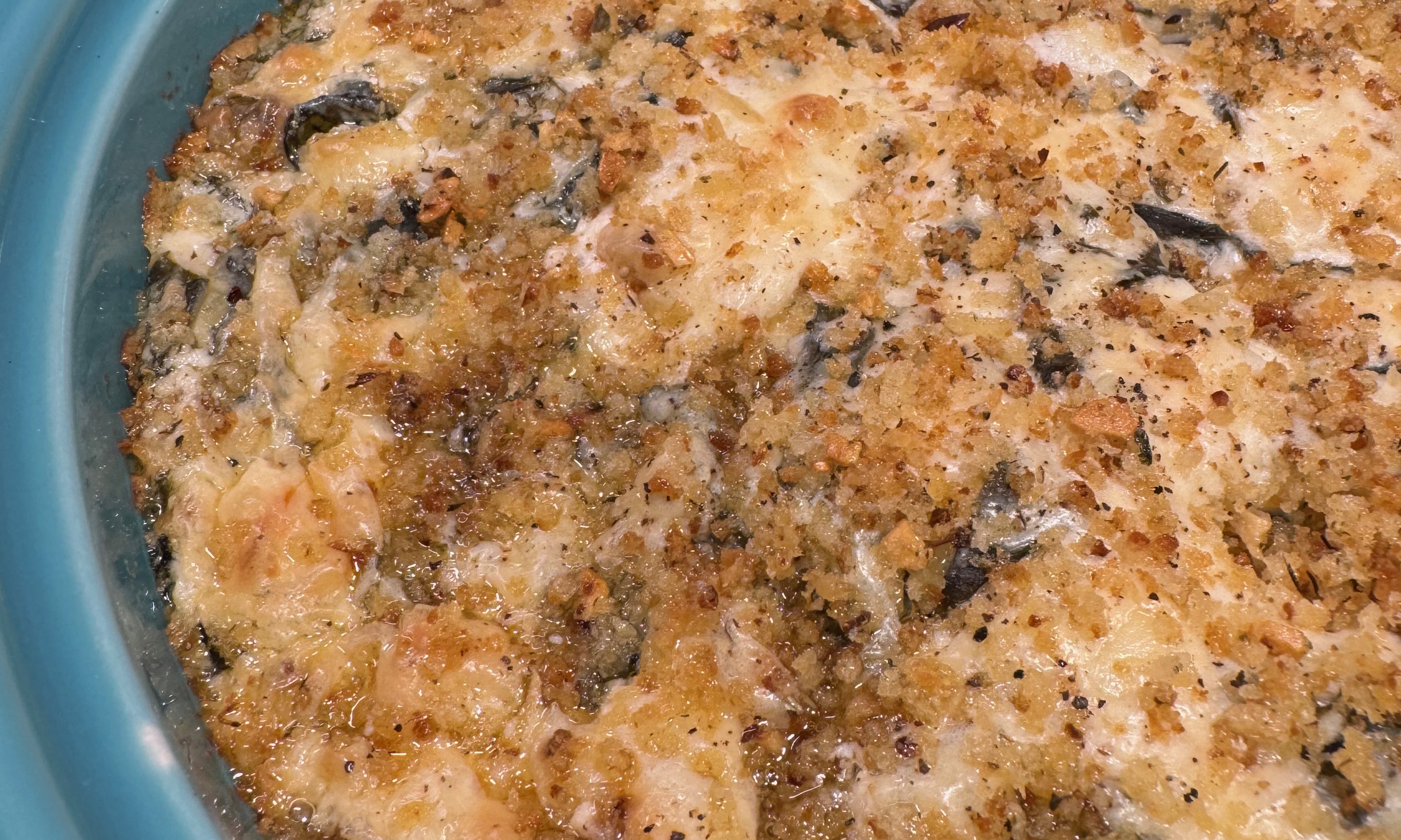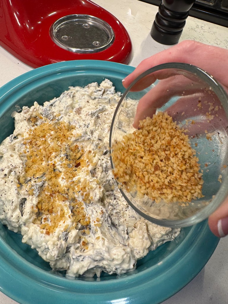 - Sprinkle toasted panko crumbs evenly over the top of the dip. Bake 30 minutes, or until dip is hot and bubbly around the edges. Cool for a few minutes before serving.