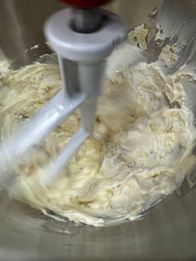 - Combine cream cheese, mayo, sour cream, garlic and pepper flakes in the bowl of a stand mixer, fitted with the paddle blade. Beat until evenly blended.