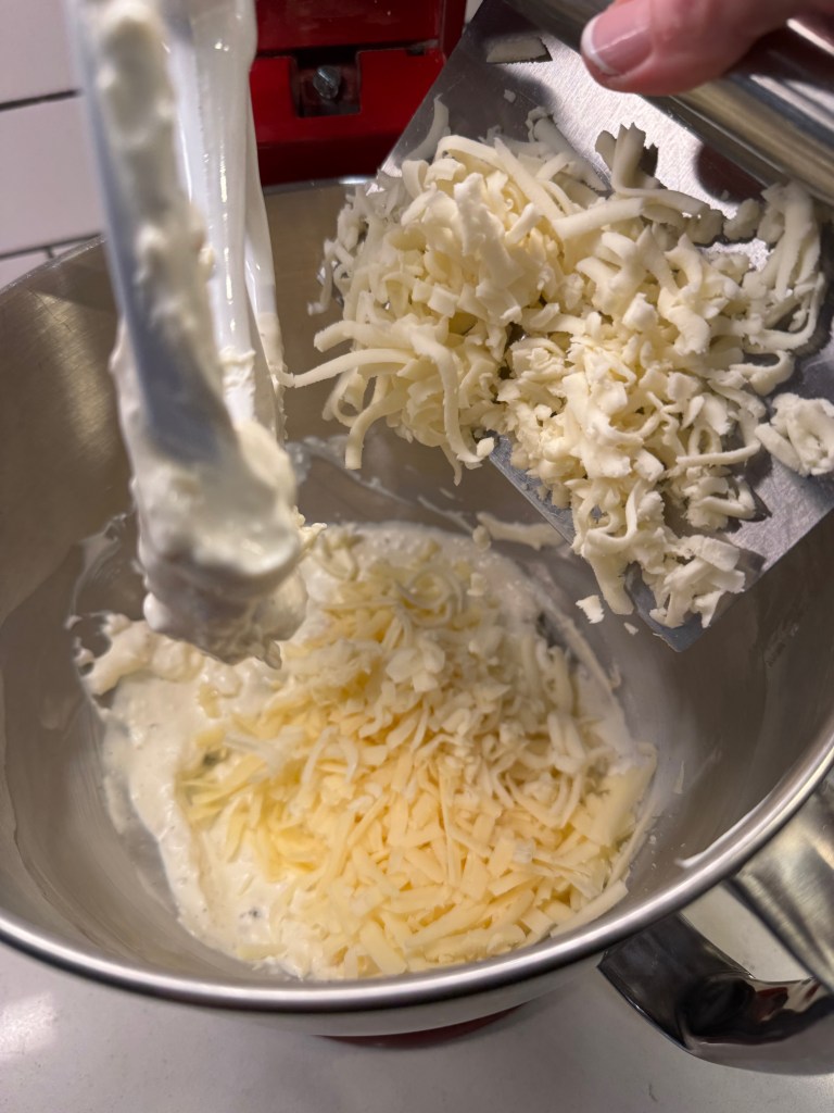 - Add cheddar and mozzarella to the bowl and mix until combined.