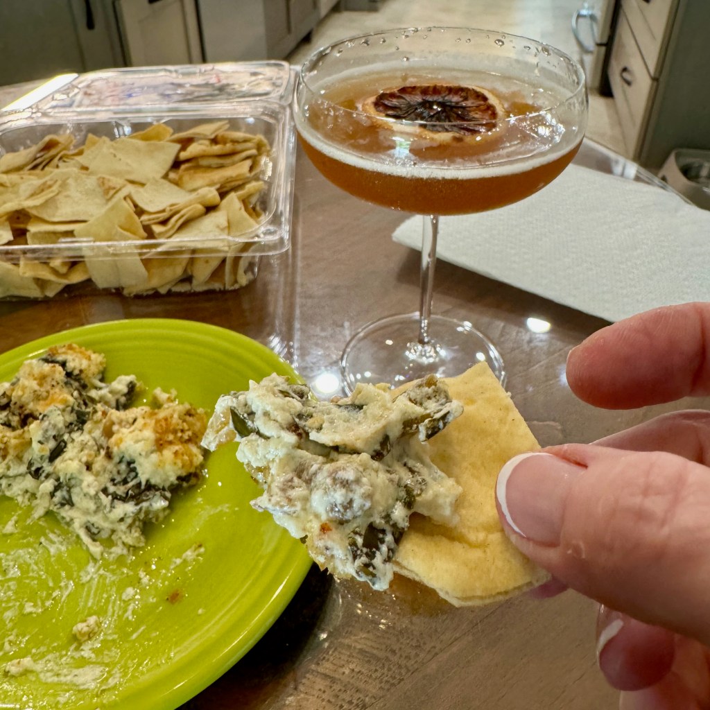 Today, that restaurant is called Kau, an open-concept restaurant with high ceilings, retrofitted into a retired textile mill. It bills itself as a steakhouse— a fair description, given that it has an in-house butcher shop where you can also purchase an array of meats to take home— but we were impressed with its other offerings, including this addictive appetizer. Collard dip is hearty, rustic and comforting— perfect for fall— and as we enjoyed ours across the table at Jerry’s favorite new hotspot, I promised him that I would recreate the dip one day at home and put it up on Comfort du Jour. Even better, we’d have him over and chat over a cocktail, preferably bourbon.